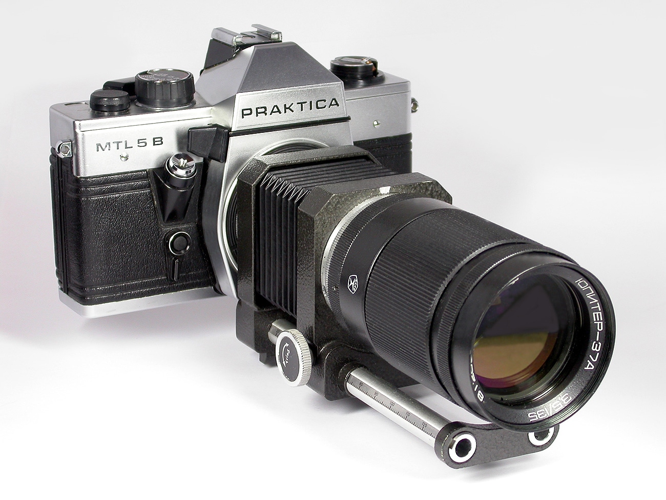 Balgengerät unbezeichnet, deutsch, vermutlich DDR, 1970er Jahre. Metall, Lackierung mit Hammerschlageffekt. Deutsche Beschriftung „Trieb“ und auf dem anderen Knopf „los“ und „fest“. Hier mit russischem Teleobjektiv Kazan KOMZ Jupiter 37A 1:3,5/135 mm (Sonnar-Typ). Kamera: Praktica MTL 5 B.