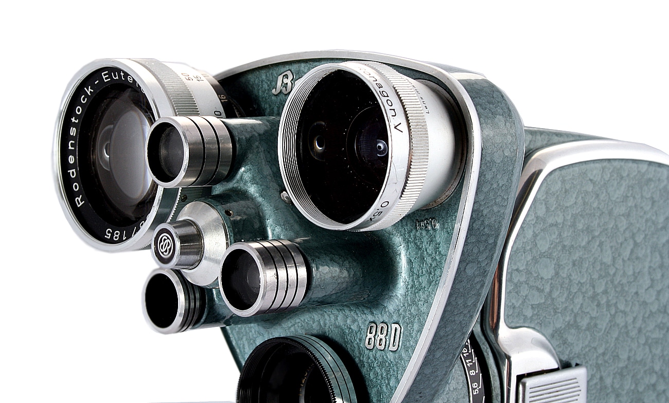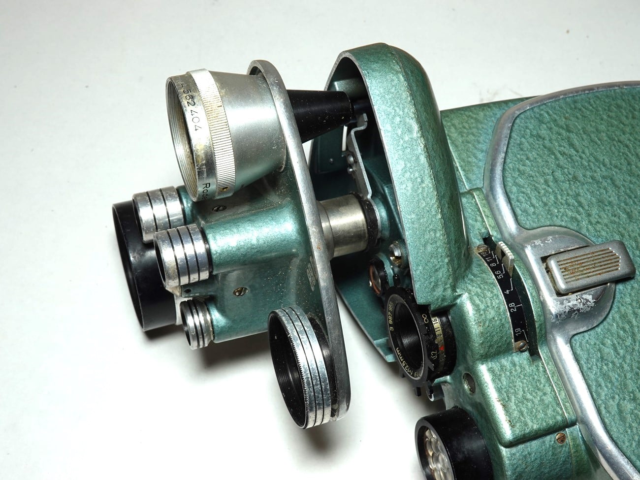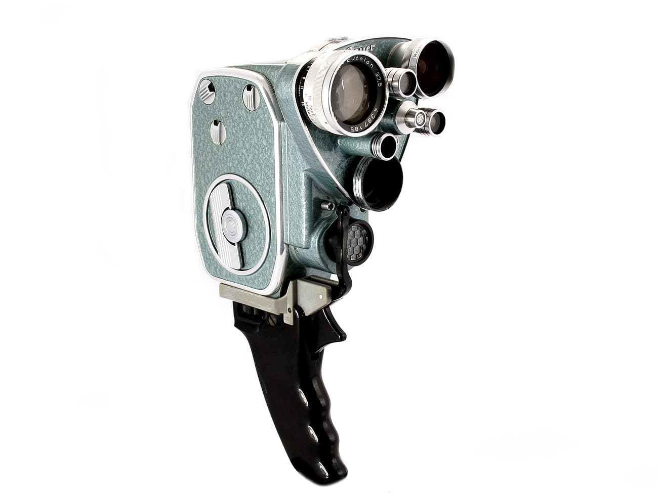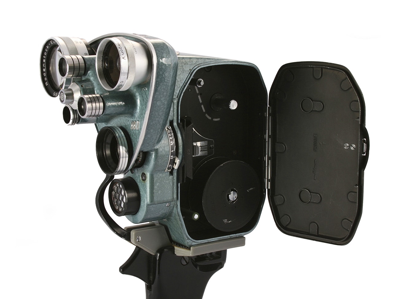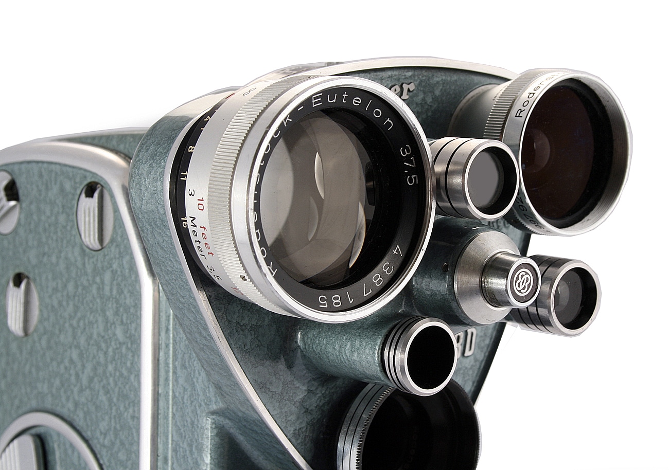 Irgendwie keine Schönheit, aber ein faszinierendes Zeugnis deutscher Kameratechnik für den Doppel-8-Film. Hergestellt von der Eugen Bauer GmbH, Stuttgart-Untertürkheim, in den Jahren 1958 bis 1960. Objektive: Grundobjektiv Rodenstock-Ronar 1:1,9/12,5 mm, manuelle Fokussierung; durch Objektivrevolver zuschaltbar: Rodenstock-Eutelon R 37,5 mm, manuelle Fokussierung, und Rodenstock-Ronagon R 0,5, Fixfokus. Bei jeder Umschaltung der Brennweite wird der Sucher automatisch angepasst. Fernrohrsucher mit 15 Linsen und Dioptrienkorrektur. Filmtransport mittels Federwerk (Einzelbildschaltung sowie 8, 16, 24 oder 48 Bilder pro Sekunde), gekuppelter Belichtungsmesser mit Selenzelle, manuelle Belichtungssteuerung. Pistolengriff.