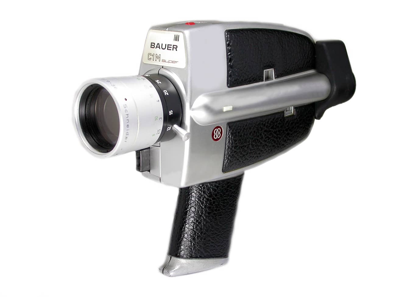 Schmalfilmkamera von Bauer (Bosch) in Stuttgart für Super-8-Kassetten, Bauzeit von 1967 bis 1972. Objektiv: Bauer Vario 1:1,8/9-36 mm, manuelle Fokussierung, Brennweitenverstellung manuell oder motorisch. Reflexsucher. Elektrischer Filmtransport (Einzelbildschaltung, 18 und 24 Bilder pro Sekunde); TTL-Belichtungsmessung, Belichtungsautomatik (Lichtregler); Fixtaste zur Fixierung des Blendenwertes (rote Taste auf dem Gehäuse). Hier auf der linken Kameraseite zu sehen: Filmsortenanzeige, Schalter für Zoomantrieb, Schalter für Ganggeschwindigkeiten.