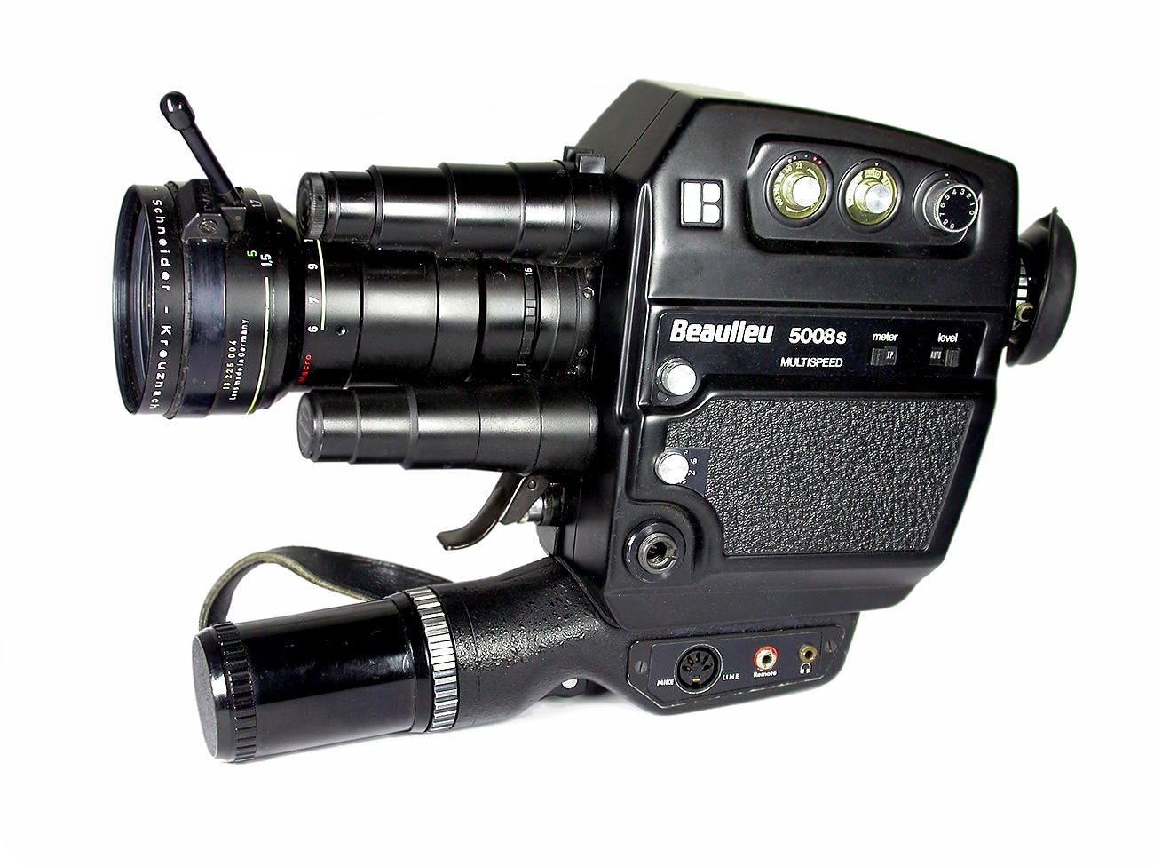 Wertvolle Schmalfilmkamera aus gutem Hause, für Super-8-Kassetten: die Beaulieu 5008 S Multispeed, gebaut von 1974 bis 1976. Für Wechselobjektive mit C-Mount, hier mit Schneider-Kreuznach Beaulieu-Optivaron 1:1,4/6-70 mm; manuelle Fokussierung (einschließlich Makrobereich), Brennweitenverstellung manuell oder motorisch (zwei Geschwindigkeiten). Reflexsucher. Elektrischer Filmtransport (8, 18, 24 und 45 Bilder pro Sekunde); CdS-Belichtungsmesser, automatische Belichtungssteuerung. Weitere Ausstattung: Fade; Tonsynchronkontakt. Auffällig: Der Akku als Verlängerung des Kameragriffs.