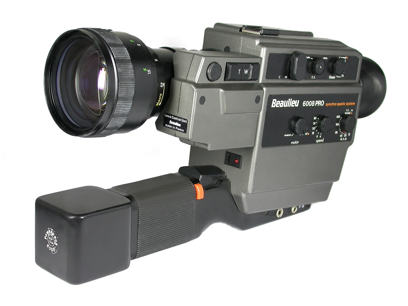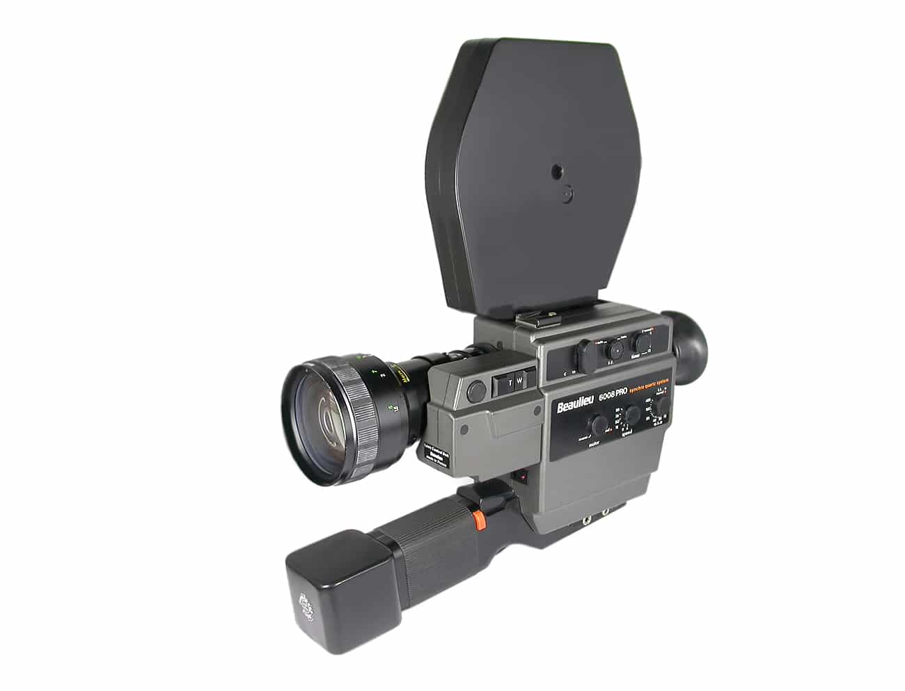Wertvolle Super-8-Kamera aus gutem Hause: die Beaulieu 6008 PRO Synchro Quartz System (mit Ton), gebaut von 1981 bis 1983. Ausstattung: Makro, Fade, Timer, Blitzsynchronkontakt, Motorzoom. Gänge: 1, 4, 9, 18, 24, 25, 36 und 80 Bilder pro Sekunde. Objektivausstattung hier: Beaulieu-Zoom Macro 1:1,4/6,9-55 mm. An diese Kamera passt auch das 60-Meter-Tonfilmmagazin Kodachrome 40.
