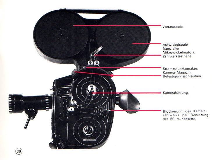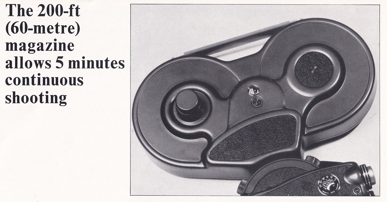 Stromversorgung: mittels 12-Volt-Nickel-Cadmium-Akku, normalerweise mit 500 mAh, integriert im Handgriff (die Röhre rechts im Bild mit der Aufschrift Beaulieu). Im Foto das Museumsmodell mit dem starken 1.000-mAh-Akku, der 16 Spulen mit 30 Meter Film oder acht Filme mit der 60-Meter-Kassette bewältigt; der 500-mA-Akku schafft etwas weniger als die Hälfte.
