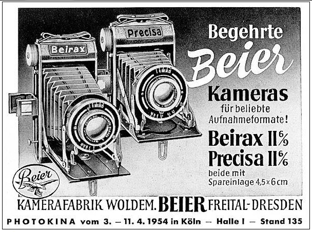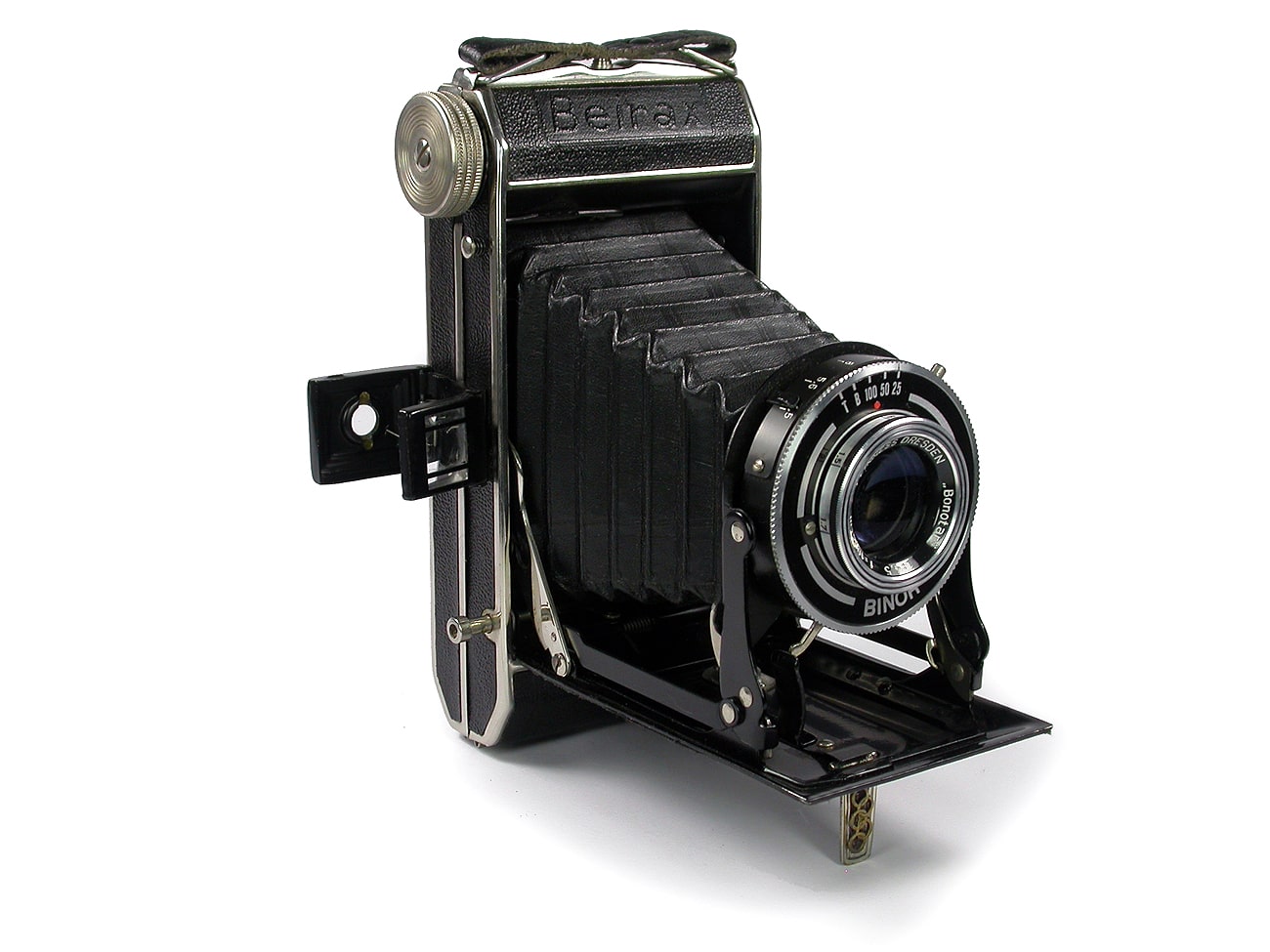 Klapp-/Spreizenkamera für den Rollfilm 120/620/B2 (Aufnahmeformate 6 x 9 cm und 6 x 4,5 cm), hergestellt in Freital bei Dresden ab 1950. Objektiv: Feinmess Dresden Bonotar 1:4,5/105 mm; manuelle Fokussierung. Aufklappbarer Newtonsucher mit Begrenzung für Halbformataufnahmen. Mechanischer Zentralverschluss Binor (T, B, 1/25 bis 1/100 Sekunde); manuelle Belichtungssteuerung. Gehäuseauslöser.