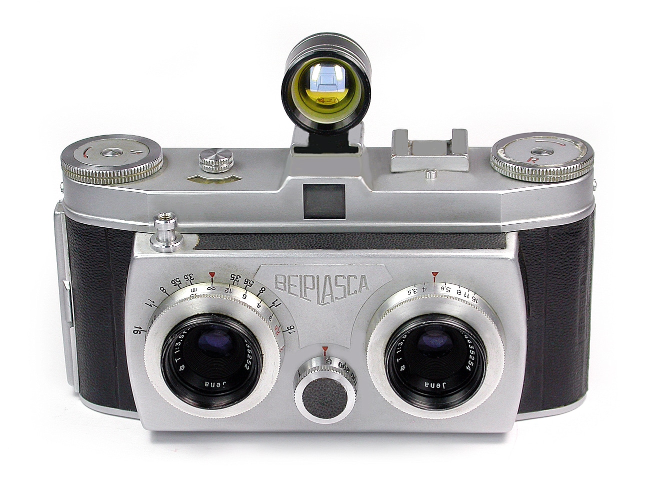 Kleinbildstereokamera (1955) aus der DDR (Film 135, Negativformat: je 24 x 30 mm). Die zwei Objektive (Tessar 1:3,5/37,5 mm T) und zwei Zentralverschlüsse Cludor (B, 1 bis 1/200 Sekunde) sind miteinander gekoppelt. Möglich waren etwa 20 Stereo-Bildpaare auf dem 36er-Film. Zusatzgeräte: spezieller Bildbetrachter und Bildwerfer Belplascus, Vorsatzlinsen-Set für den Nahbereich. DDR-Qualitätskennzeichen: S (Standard).