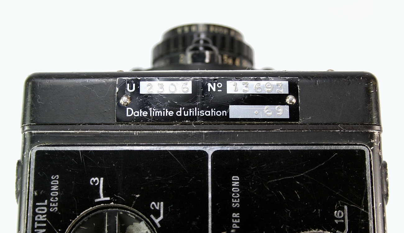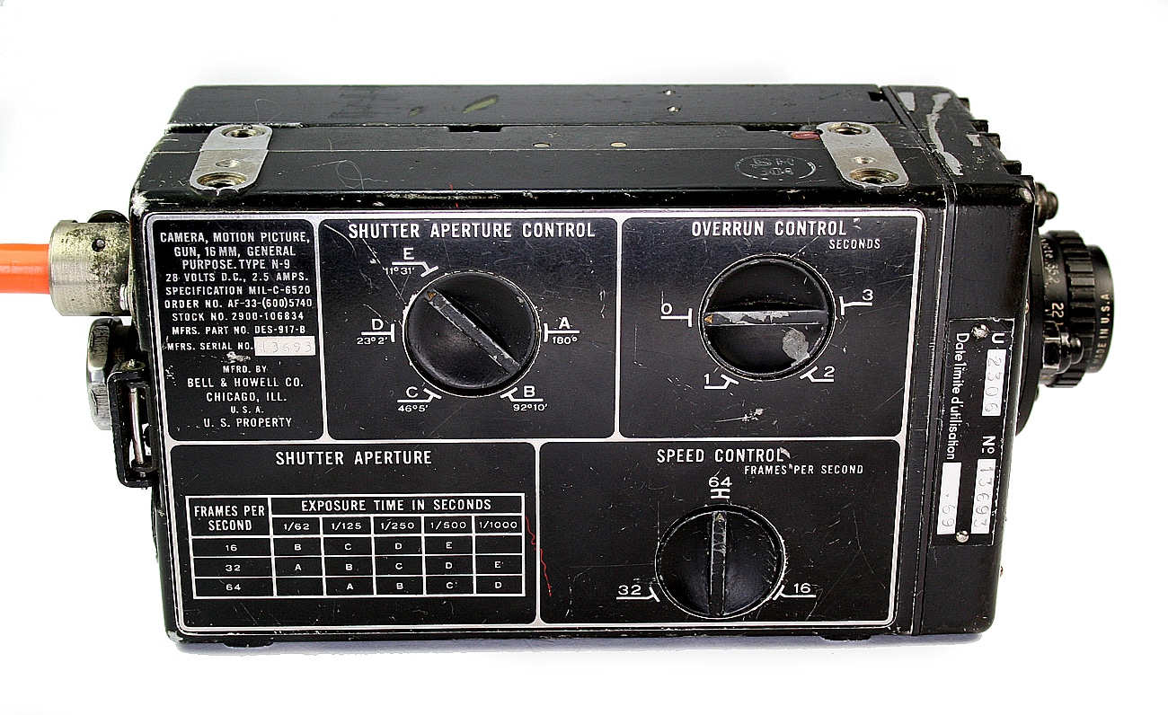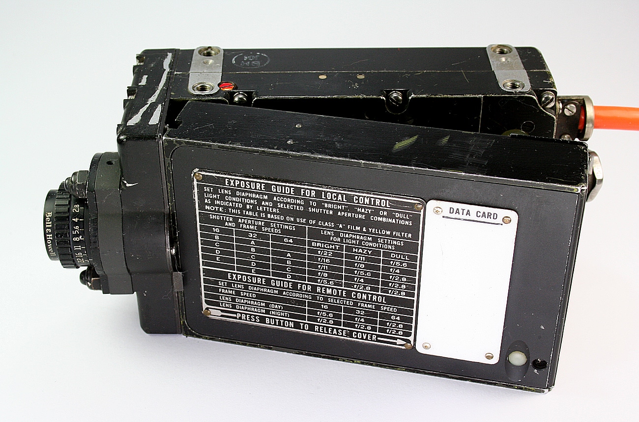 Eine sogenannte Gun Camera für den Starfighter F 104 – vermutlich aus einem französischen NATO-Kampfflugzeug aus den 1960er Jahren. Die elektrisch angetriebene 16-mm-Filmkamera (28 Volt/2,5 Ampere) wurde von Bell & Howell, Chicago (USA) hergestellt, aber offenbar auch von Leitz Canada (für die kanadische Luftwaffe). Mit Kameras eines ähnlichen Typs wurden bereits im zweiten Weltkrieg Luftkämpfe gefilmt und die Abschüsse dokumentiert.