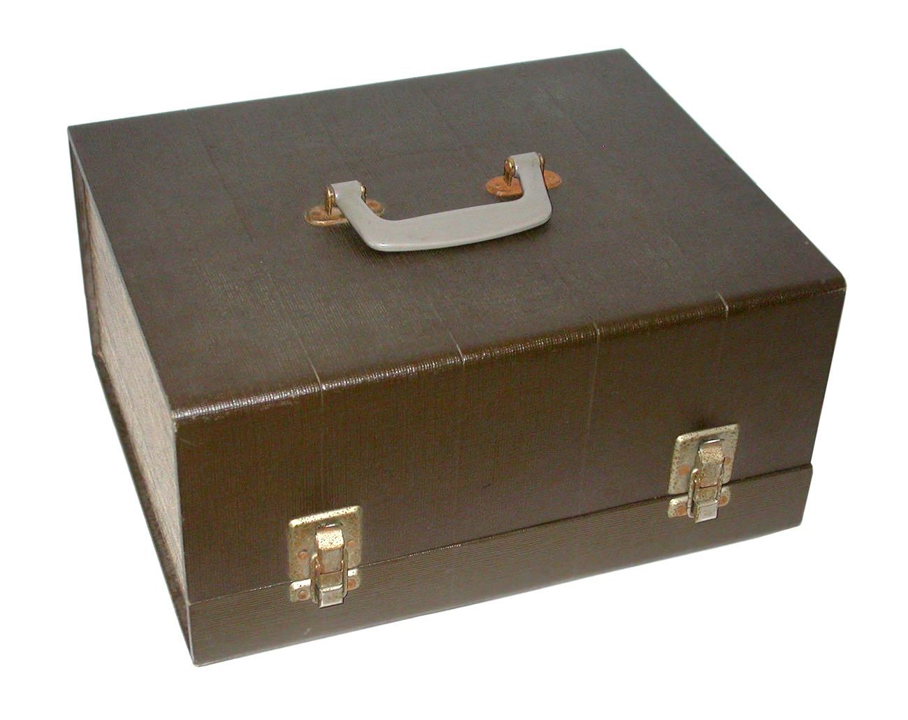 Diaprojektor von Bell & Howell, Chicago/USA, 1956. 115 Volt, 325 Watt, Lampe maximal 300 Watt, eingebautes Gebläse (Ansaugöffnung im Boden). Die Magazinhalterung „Selectron Semimatic“ mit manuellem Diavor- und Einschub ist auswechselbar gegen einen einzelnen Diaschieber. Bewegt man ein neues Dia in die Projektionsachse, wird das vorherige Dia auf der gegenüberliegenden Seite ausgeworfen. Die hier passenden Magazine vom Typ „Yankee universal 30 (40) slide tray“ ähneln stark den Paximat-Magazinen. Objektiv: Bell & Howell Anastigmat Trionar 1:3,5/4 Zoll (etwa 100 mm).