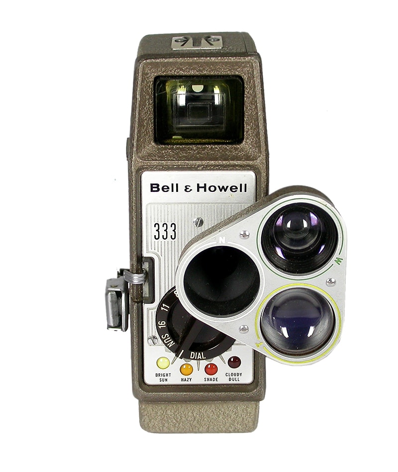 Schmalfilmkamera für Doppel-8-Spulen, hergestellt von Bell & Howell (USA) in den 1950er Jahren. Objektivrevolver (Normalbrennweite als Grundobjektiv im Kameragehäuse, Weitwinkel und Tele als Vorsatzobjektive im Revolver); Fixfokus. Durchsichtsucher mit verschiedenen Rahmen für die Motivauswahl entsprechend der aktuell eingestellten Brennweite. Federwerksantrieb (Einzelbild; 16 Bilder pro Sekunde); manuelle Belichtungssteuerung gemäß „SUNDIAL“ (Zuordnung der Blenden zur Beschreibung der Lichtverhältnisse, z. B. „bright sun“, auf einem Drehschalter) oder mit Hilfe eines aufgesteckten Belichtungsmessers als Zubehör (Steckschuh auf der Oberseite der Kamera).