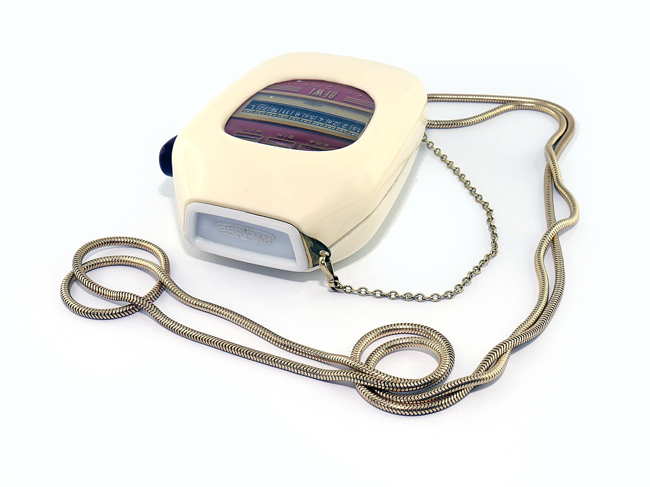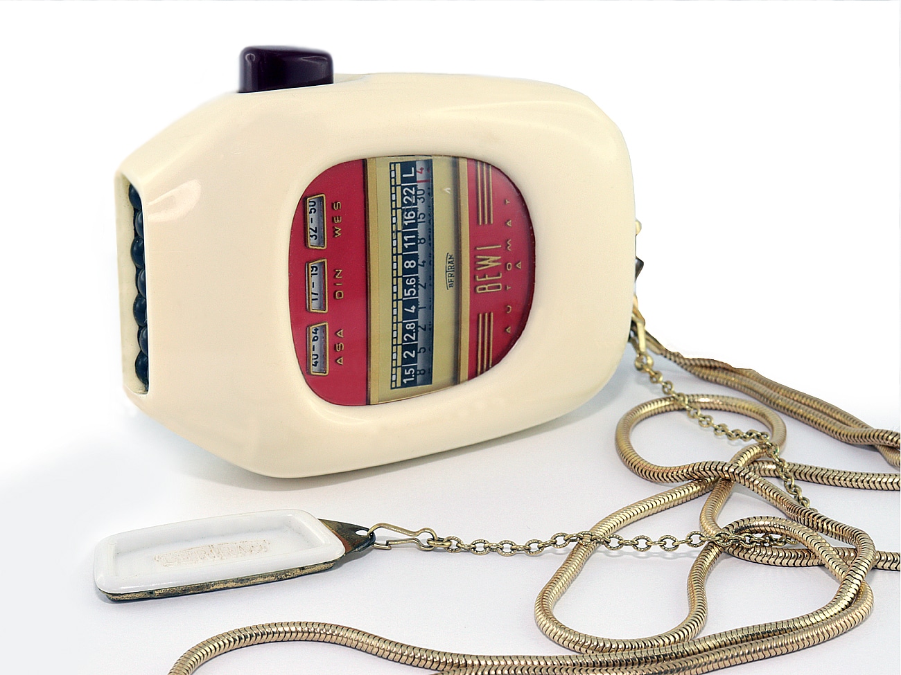 Fotoelektrischer Selen-Belichtungsmesser von Bertram, München, 1956. Automatische Anzeige, Drucktaste, Einhandbedienung, Kunststoffgehäuse mit Metallkette. Aufsteckbare Diffusorscheibe unverlierbar – im Bild – an dünner Metallkette gesichert. Zeitenbereich: 1.000 Sekunde bis 4 Minuten, Blenden 1,5 bis 22. Cineeinstellungen von 8 bis 64 Bilder pro Sekunde.