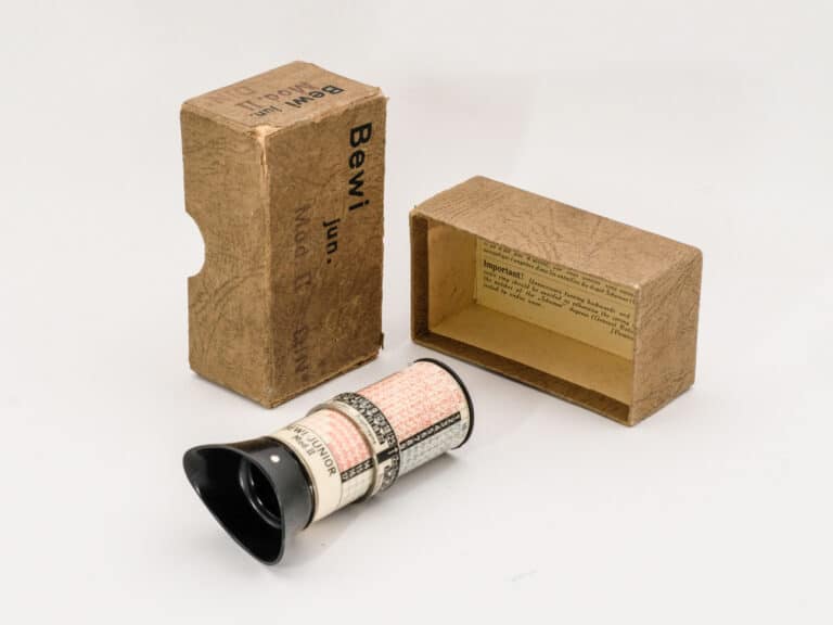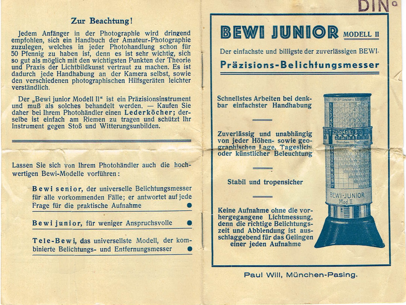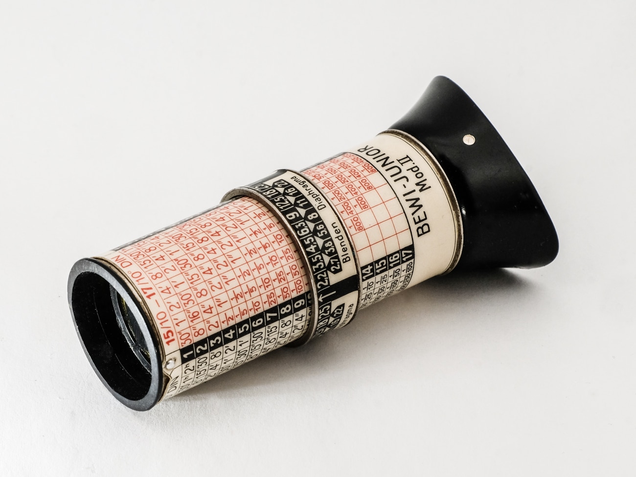 Optischer Belichtungsmesser von Bertram, München, etwa 1937. Dieses Modell ist die abgespeckte Version des BEWI Senior. Beim Blick durch das Okular ist eine Zahlenreihe (Lichtwerte) mit abnehmender Helligkeit zu erkennen. In Motivrichtung gesehen ist die Zahl maßgebend, die man gerade noch erkennen kann. Auf der Außenfläche des Gerätes sind in drei farblich unterschiedlichen Feldern Tabellen mit Belichtungszeiten angeordnet: DIN 12-14 in schwarz, DIN 15-17 in rot, DIN 18-20 in blau. Auf einer schwarzen in Längsrichtung verlaufenden Skala sind Lichtwerte aufgetragen. Ein verschiebbarer Ring trägt für jedes der drei Zeitenfelder eine Blendenskala (deutsche und internationale Reihe). Schiebt man diesen Ring auf den ermittelten Lichtwert, kann man für die jeweilige Empfindlichkeit die Belichtungswerte ablesen. Die Tabellenwerte: Zeiten von 1/800 Sekunde bis 2 Stunden (!), Blenden 2,2-25, Empfindlichkeiten DIN 12-20, Lichtwerte 1-17.