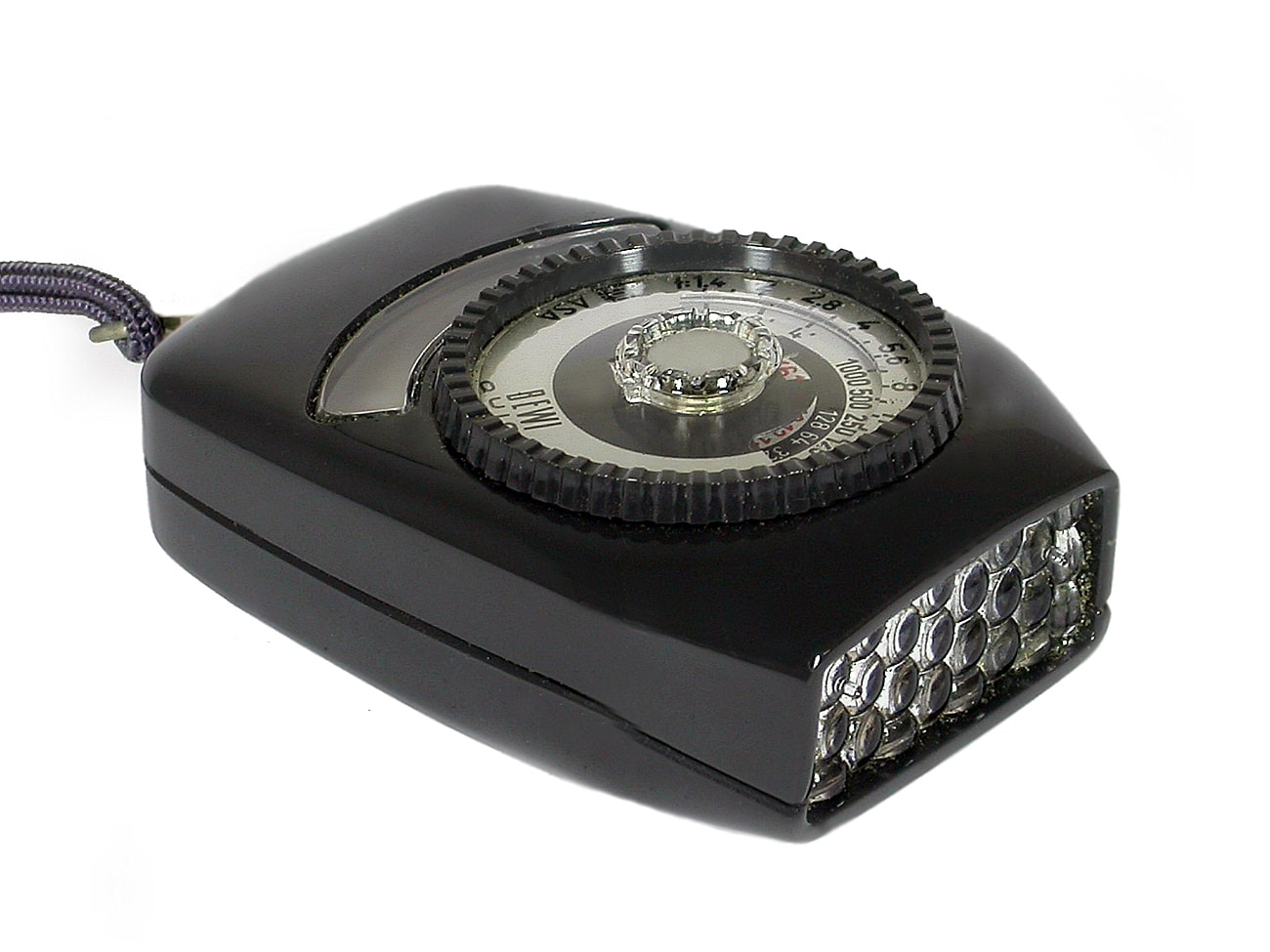 Fotoelektrischer Selen-Belichtungsmesser, hergestellt in der Bundesrepublik Deutschland in den 1960er Jahren; auch für Filmfreunde. DIN/ASA-Einstellung, mit Kordel und Ledertasche. Damals auch in Weiß lieferbar.