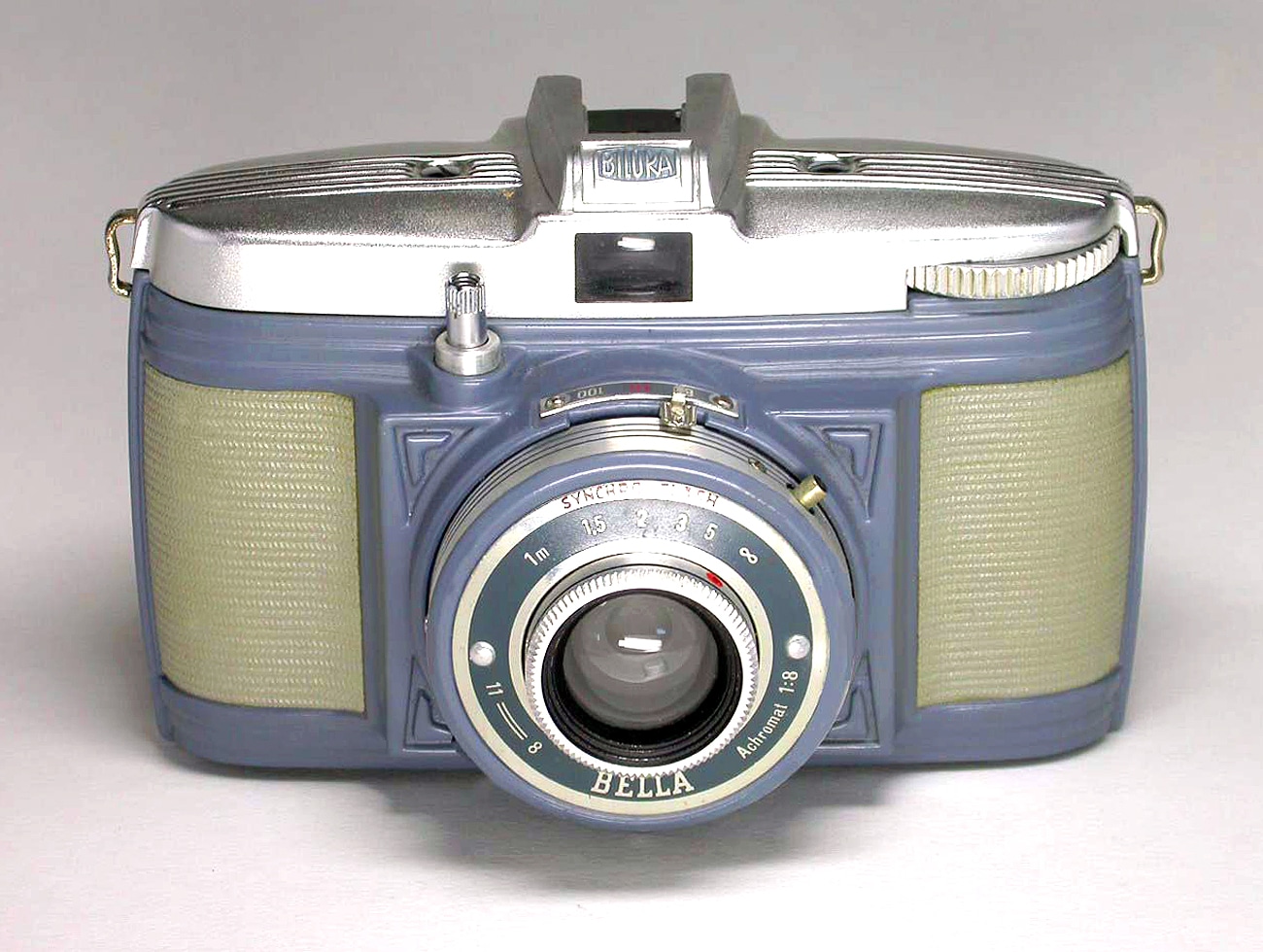 Bella ähnlich der Bella 44: Eine Bilora-Kamera für den Rollfilm 127 (Aufnahmeformat 4 x 6,5 cm), hergestellt von 1955 bis 1958. Objektiv: Achromat 1:8; Einfachverschluss (1/50, 1/100 Sekunde und B), Synchrobuchse für Blitzgerät.
