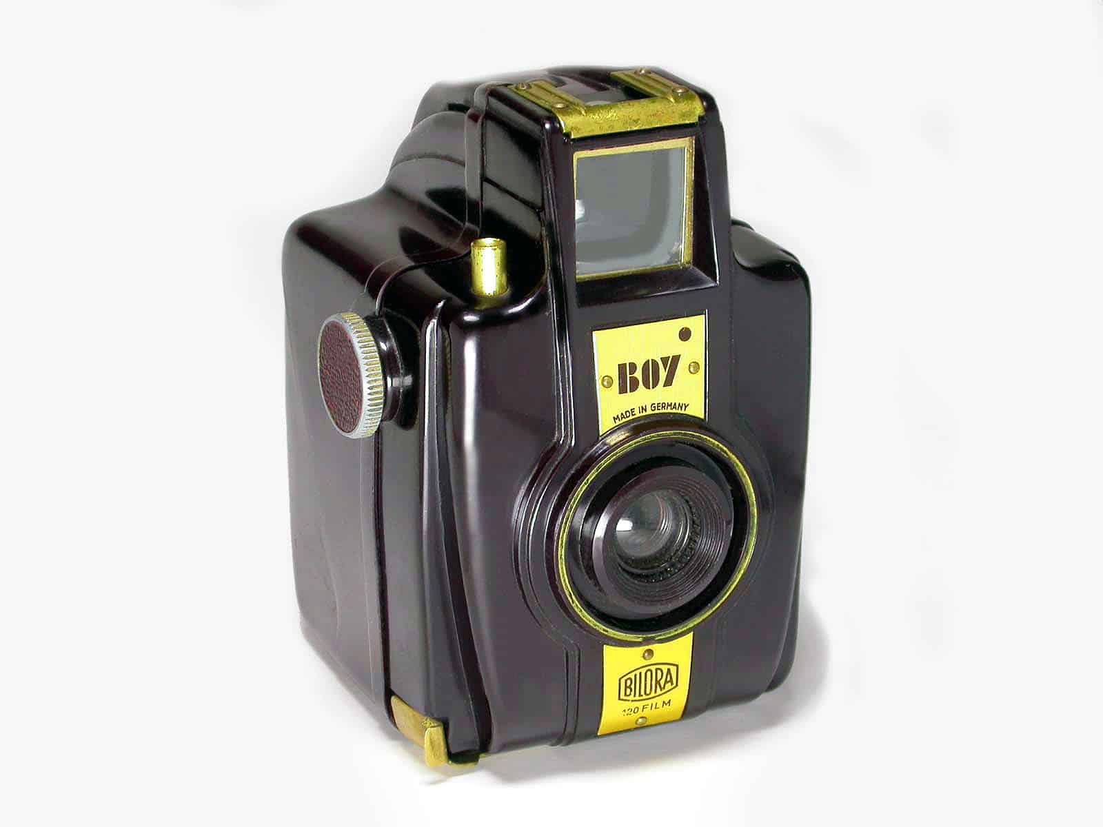 Die kleine Boxkamera „Boy“ für den Rollfilm 127 war in den 1950er Jahren weit verbreitet. Hier nun die vornehmer gestylte Blitz-Boy von 1957 (Mittenkontakt im Zubehörschuh), die bereits für normalen Rollfilm 120 (Aufnahmeformat 6 x 6 cm) konstruiert war. Objektiv: Meniskuslinse 1:11; Durchsichtssucher; Einfachverschluss; Bakelitgehäuse, Auslöser mit Drahtauslöseranschluss; kein Stativgewinde.