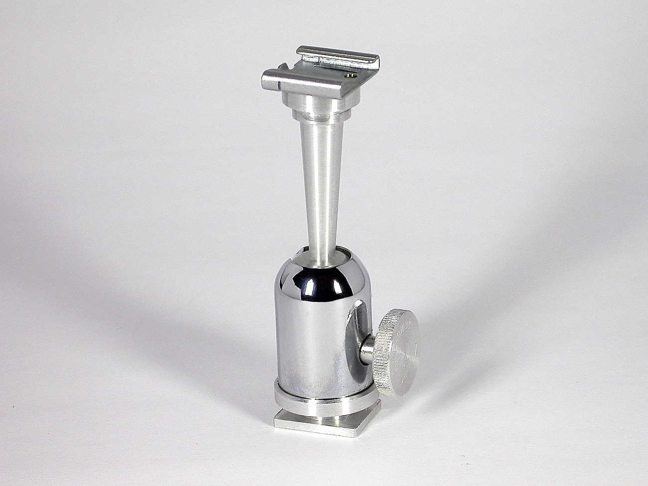 Als es noch keine Blitzgeräte mit Schwenkreflektor gab, benutzte man solche Blitzneiger, um den Blitz in die gewünschte Stellung zu bringen. Der Neiger konnte entweder selbst im Zubehörschuh einer Kamera, auf einem Stativ (Gewinde) oder an Lochschienen usw. befestigt werden. Nicht nur der Kugelkopf selbst, sondern das ganze Oberteil konnte beliebig gedreht werden. Hier eine Version mit langem Hals zur Vermeidung des Rote-Augen-Effekts. Es gab auch Varianten mit kurzem Hals.