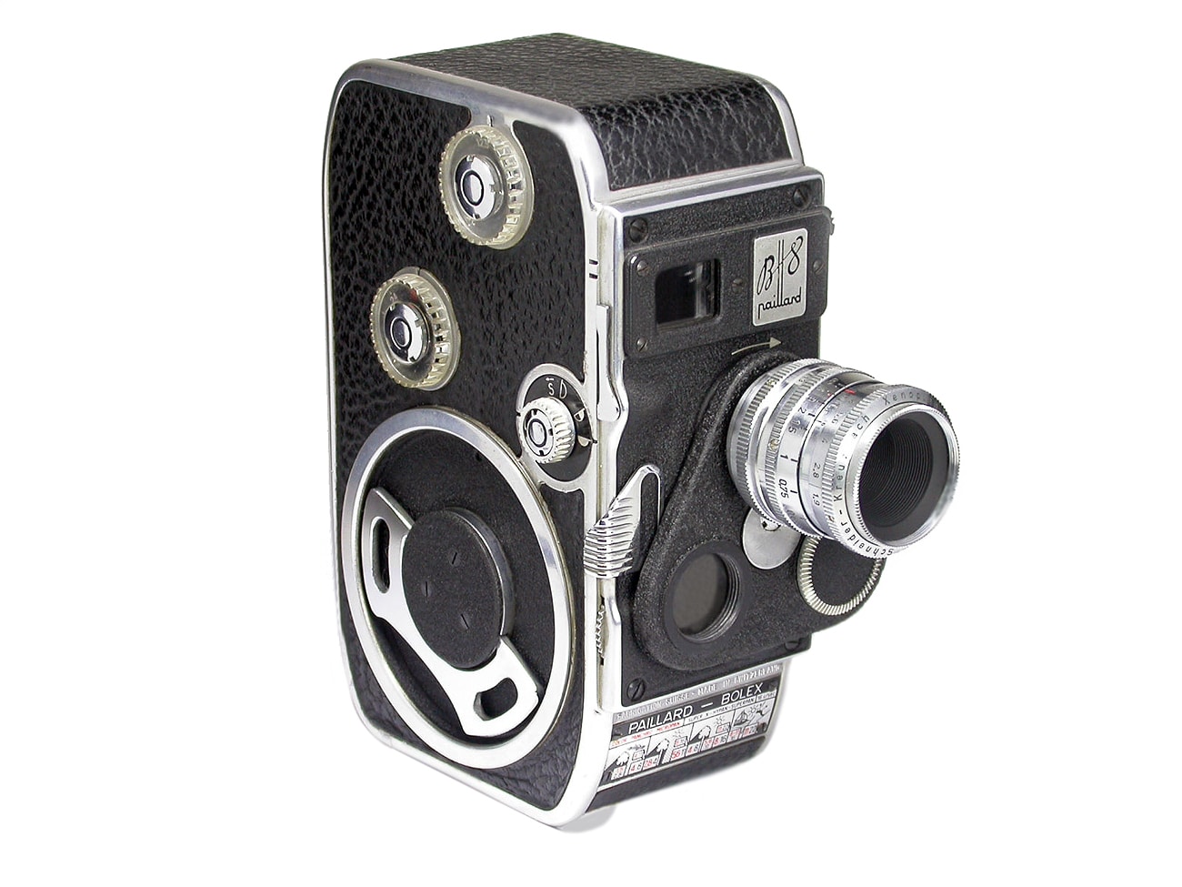 Schmalfilmkamera für Doppel-8-Spulen, hergestellt von 1953 bis 1958, „Zwilling“ der Bolex C 8. Objektivrevolver für Wechselobjektive mit D-Schraubfassung, hier mit Schneider-Kreuznach Xenoplan 1:1,9/13 mm; manuelle Fokussierung. Fernrohrsucher. Federwerksantrieb (Einzelbild, 8, 12, 16, 32, 48 und 64 Bilder pro Sekunde; Dauerlauf möglich); manuelle Belichtungssteuerung. Dieses Modell hier ist offen.bar Baujahr 1957 (erkennbar an der variablen Sektorenblende rechts oberhalb des Federwerkaufzugs). Weitere Modelle dieser Grundbauform: Bolex B 8 L (zwei Objektive), Bolex D 8 L (drei Objektive), Bolex C 8.