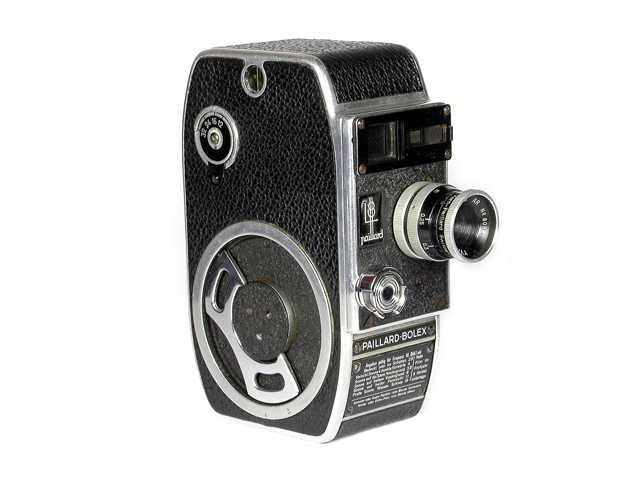 Schmalfilmkamera (Filmformat Doppel-8), hergestellt in der Schweiz von Paillard-Bolex. Die L 8 wurde von 1942 bis 1954 gebaut, ab 1947 mit unterschiedlichen Bildfrequenzen. Dieses Modell (mit Objektiv Kern-Yvar 1:2,8/12,5 mm, Seriennummer 80891) von 1947 bis 1954. Zuvor wurde die Kamera mit dem Meyer Trioplan 1:2,5/13 mm bestückt. Bildfrequenz: 12, 16, 24 oder 32 Bilder pro Sekunde; Federwerksmotor. Manuelle Belichtungssteuerung.