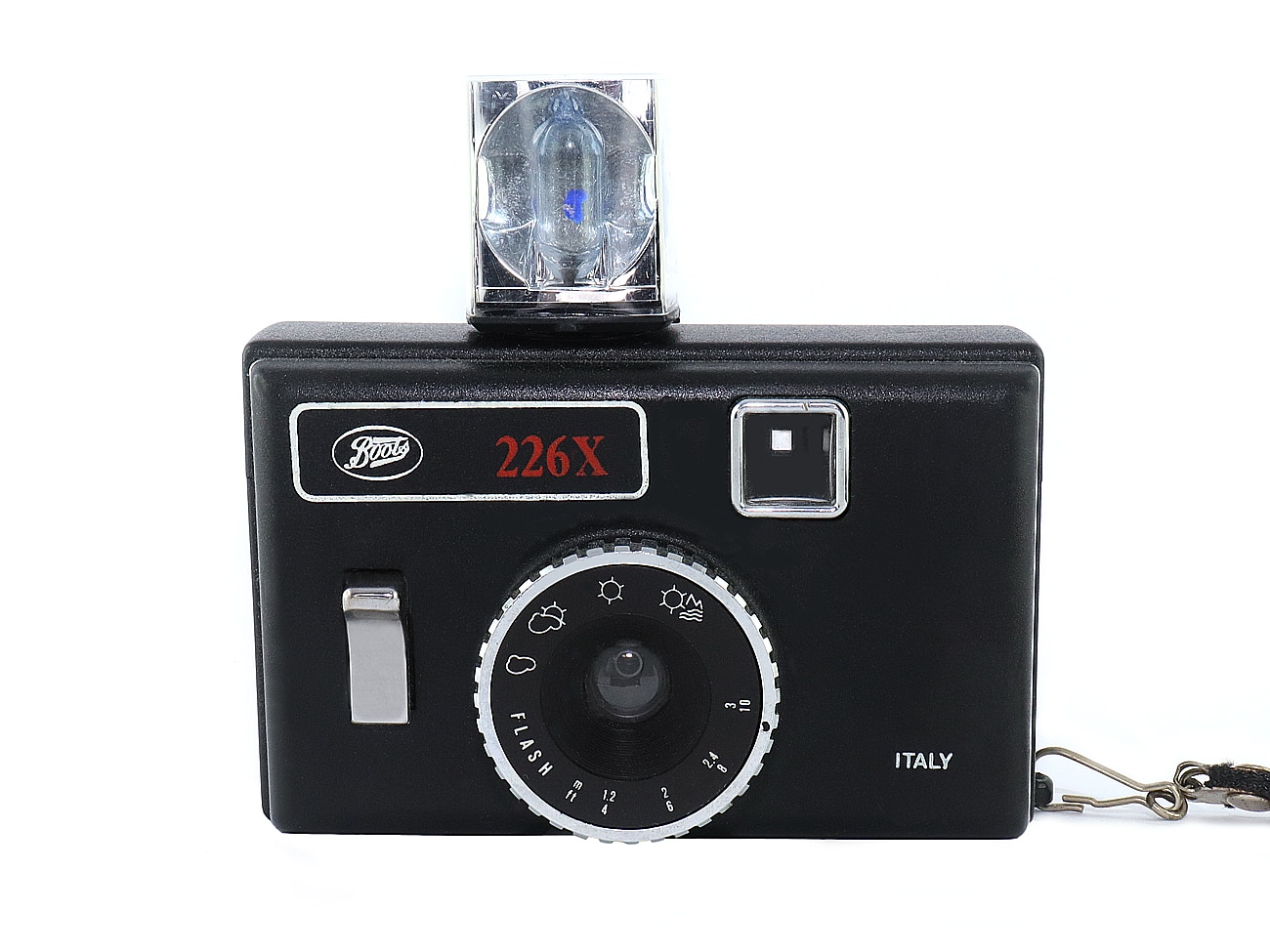OEM-Fotokamera der britischen Drogeriekette Boots in London, England, für den 126er Pak-Film (Negativformat: 28 x 28 mm) 1970er Jahre. Fernrohrsucher, Filmtransport per Schnellschalthebel, auf der Rückseite Lupe für das bessere Erkennen des aktuellen Filmnegativs. X-Blitzwürfel, Belichtungseinstellung durch geriffeltes Drehrad rund ums Objektiv nach Wettersymbolen oder nach Metern (für Blitzaufnahmen); Handschlaufe. Hergestellt vermutlich bei Bencini in Italien.