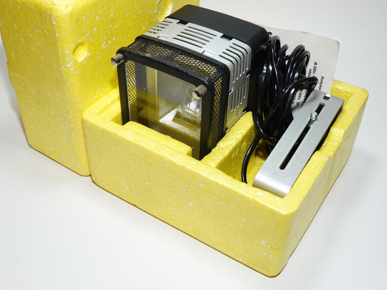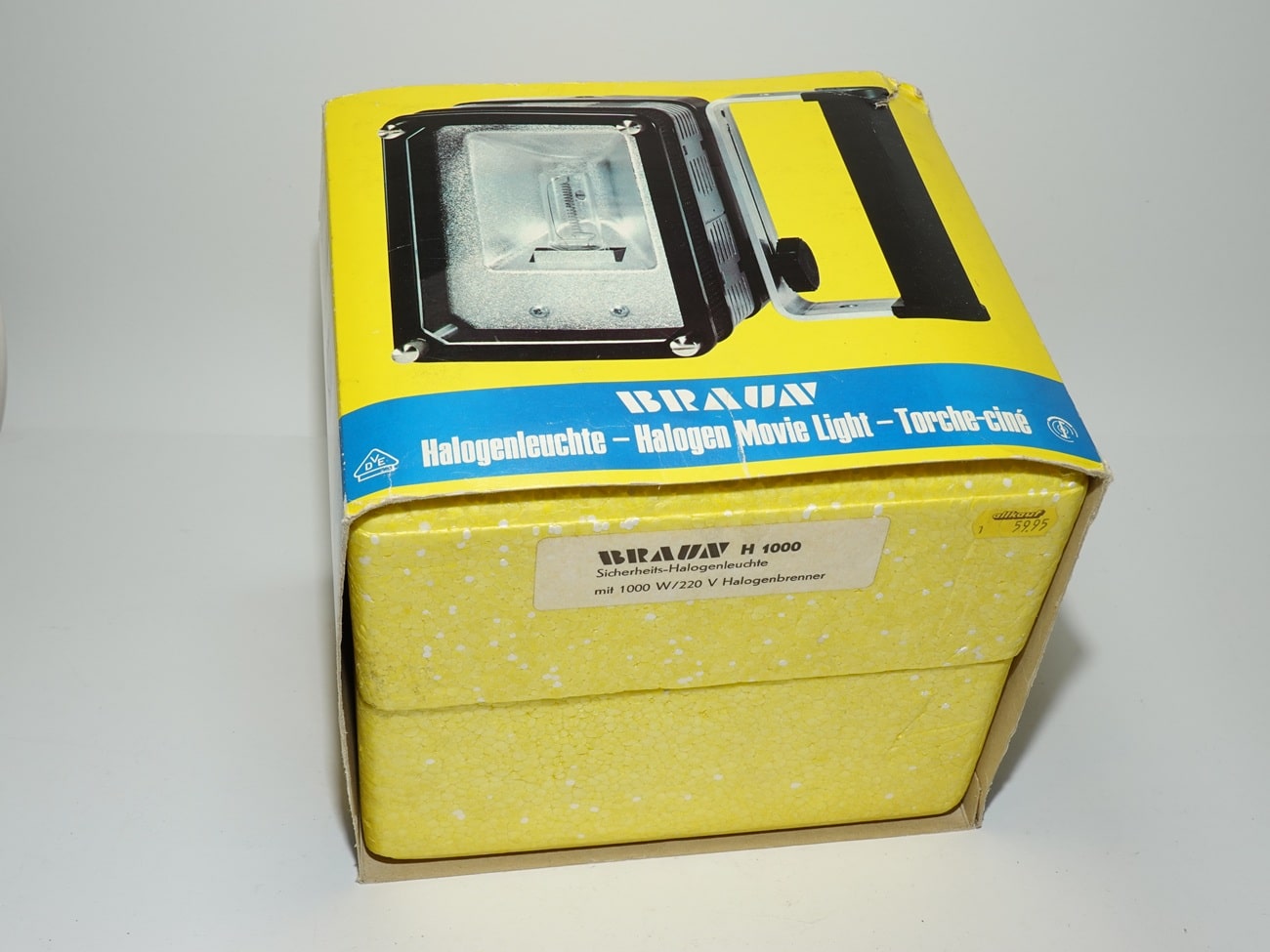 Halogenleuchte Typ Nr. 16 100, hergestellt in den 1970er Jahren in Westdeutschland von Carl Braun Nürnberg. Netzbetrieb (220 Volt, Netzkabel 4 m, Geräteschalter); ohne Gebläsekühlung, daher maximale Betriebszeit 5 Minuten. Hartglas-Schutzscheibe, Schutzkorb. Mit ansetzbarem Universalgriff; im Museum in farblich abgestimmter Originalverpackung (Gelb als dominierende Farbe, auch bei den Styroporformteilen) mit Bedienungsanleitung. Helligkeit: 33.000 Lumen; Farbtemperatur 3400° Kelvin. Damaliger Verkaufspreis: 59,95 DM.