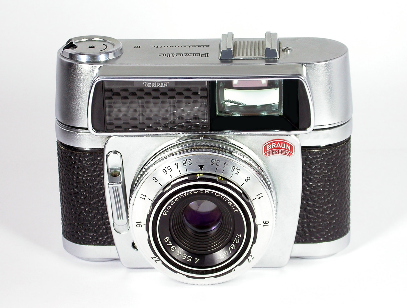 Sucherkamera für den Kleinbildfilm 135 (Aufnahmeformat 24 x 36 mm), hergestellt bei Carl Braun in Nürnberg zwischen 1961 und 1964. In diese Paxette ist der neue Gauthier-Verschluss Prontor-Matic eingebaut, der bei Stellung „Auto“ zu jeder vorgewählten Belichtungszeit von 1/30 bis zu 1/500 Sekunde die den jeweiligen Lichtverhältnissen entsprechende Blende vollautomatisch nachstellt. Bei Verschlussstellung „Manuell“ sind Blende und Zeit frei einstellbar, wobei die „Vollautomatik“ ausgeschaltet ist. Das im Sucherbild deutlich sichtbare Rot-Grün-Signal zeigt bereits beim Anvisieren des Motivs, ob die Aufnahme gelingt. Objektiv: Rodenstock-Ultralit 1:2,8/40 mm (4-Linser). Filmempfindlichkeit 10 bis 30 DIN (eingebauter Belichtungsmesser von Bertram). Der Filmschnelltransport ist mit Verschluss, Zählwerk und der vollautomatischen Blendensteuerung gekuppelt. Schnellrückspulung mit Schalthebel.
