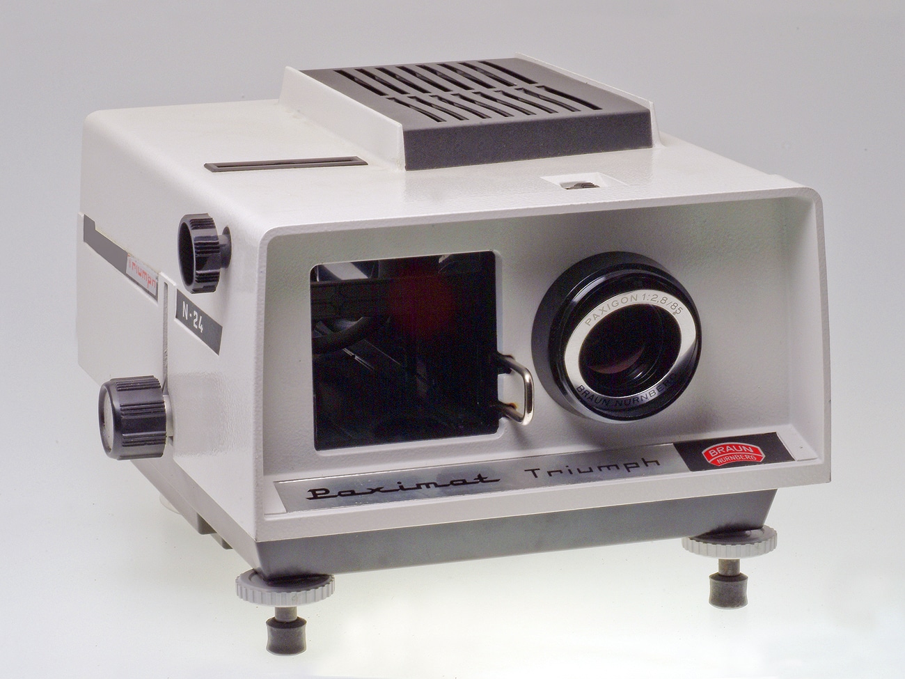 Halbautomatischer Diaprojektor von Carl Braun, Nürnberg, 1970er Jahre, für Dias mit dem Rähmchenformat 5 x 5 cm. Die speziellen Paximat-Magazine für 36 oder 50 Dias sind seitlich offen, mit einem Schieber wird das Dia in den Strahlengang geschoben und nach der Projektion in das Magazin zurückgezogen, mit dem Drehknopf schaltet das Magazin um eine Diaposition weiter. Für die Projektion einzelner Dias war ein spezieller Schieber („Slider“) verfügbar, der von der gegenüberliegenden Seite in den Strahlengang eingebracht wird. Metallgehäuse, Halogenlampe 24 Volt/150 Watt, 220 Volt Netzspannung. Kühlgebläse. Gehäuse aus Metall. Der obere Drehknopf dient der Fokussierung. Objektiv: Braun Nürnberg Paxigon 1:2,8/85 mm.