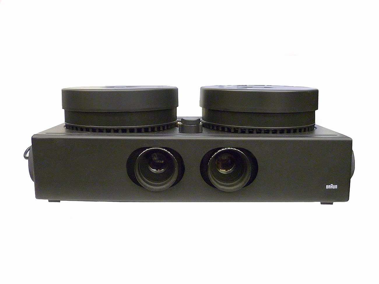 Futuristisch anmutender Diaprojektor von Max Braun (Frankfurt), ab 1974 (Design: Peter Hartwein). Das Gerät – stolze 14 kg Druckguss und Stahlblechgehäuse – war vom Enna-Werk München entwickelt worden und bildete den Abschluss des Angebots von Diaprojektoren bei Braun. Beschreibung: Dia-Projektions-System mit zwei spiegelbildlich angeordneten Projektoren. Lampenleistung: 2 x 24 Volt/250 Watt mit je einer schnell umschaltbaren Reservebirne. Objektive: zwei 90-mm-Objektive Will-Wetzlar Maginon 1:2,5 mit je fünf Linsen bis zum Diaformat 4 x 4 (weitere Objektivtypen lieferbar). Zwei Rundmagazine mit je 50 Dias in staubsicheren Kassetten. Dia-Format: 5 x 5-cm-Rahmung. Projektionsverfahren: Standard, Einblendung, Parallel- beziehungsweise 3D-Projektion (mit entsprechenden Polfiltern). Fernbedienung: Regiehandstück, Programmiergerät PG 100, Taktung mittels Timer, Handtaste, Tonband.