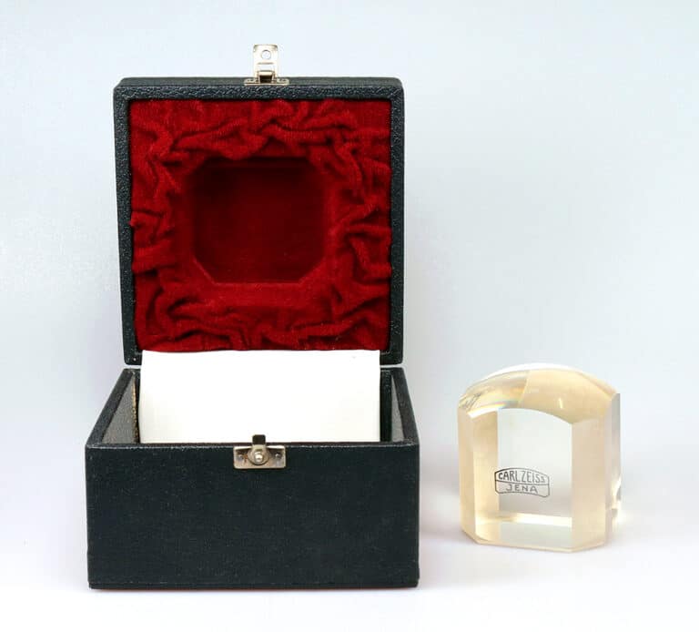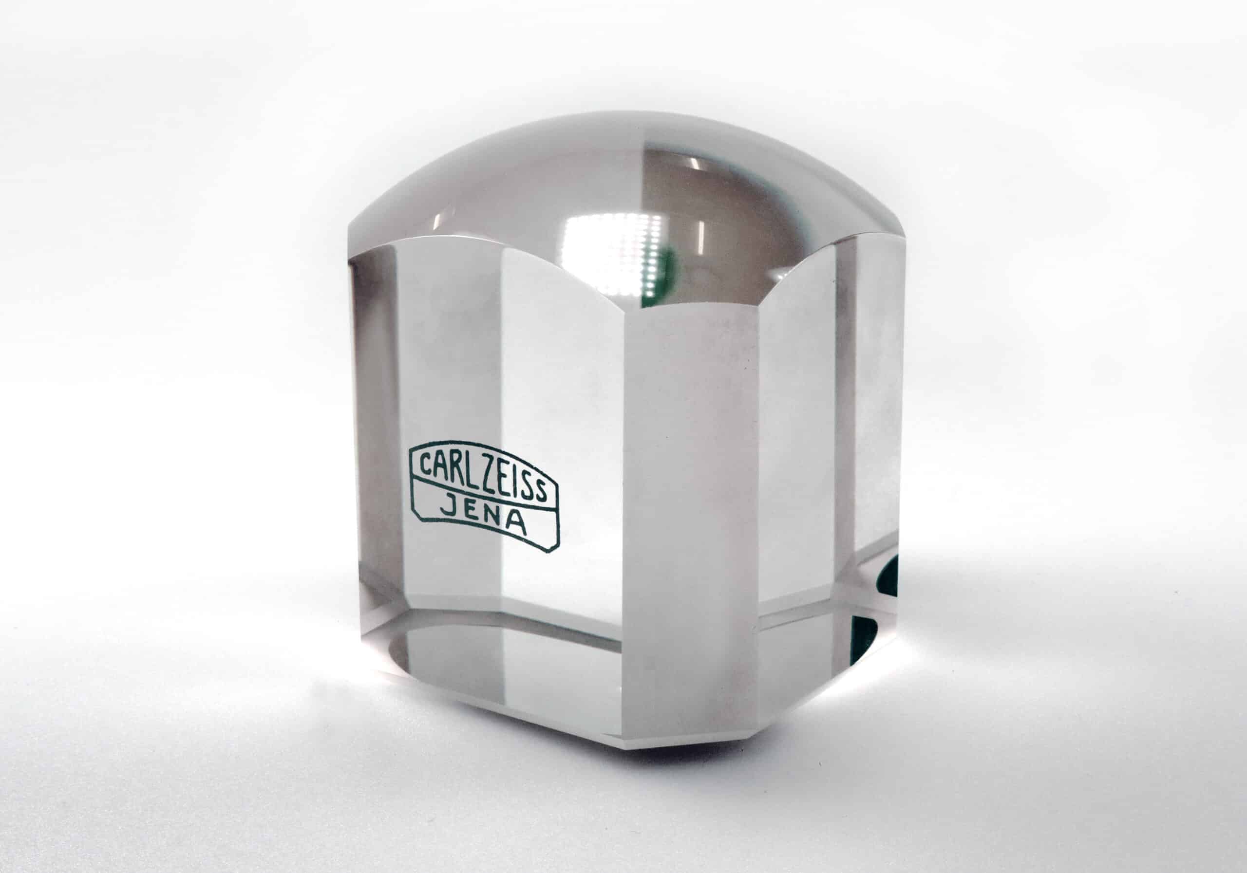 Ein Sammlungsstück, das Rätsel aufgibt: ein Briefbeschwerer „Carl Zeiss Jena“ mit den Abmessungen von etwa 8 x 8 cm und einer Höhe von 10 cm. Woher das gute Stück stammt, bei welchen Anlässen es verschenkt wurde und wann es in Umlauf kam, war nicht zu ergründen. Aber sicher eine Rarität.
