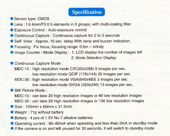 Diese MDC-10 stellt für damalige Verhältnisse halbwegs brauchbare Bilder her, zumindest als USB-Webcam, denn sie kann nur 20 „hochaufgelöste“ Bilder speichern. „Hochaufgelöst“ bedeutet hier: 352 x 288 Pixel! Das heißt nun nicht, dass man diese Kamera empfehlen könnte. Dazu ist sie zu spielzeughaft und billig produziert. Das muss ohnehin jeder selbst wissen.