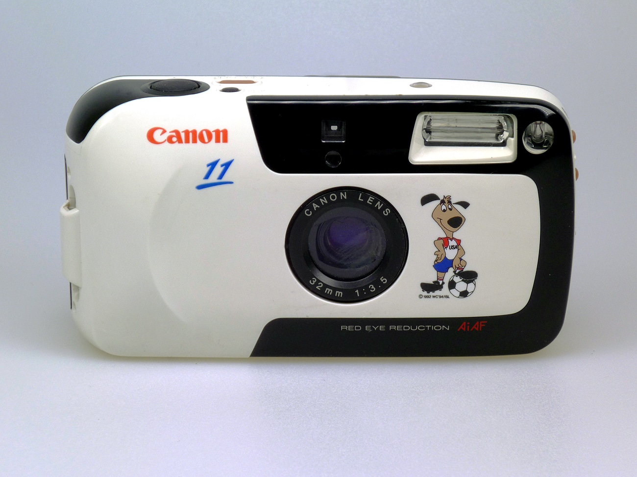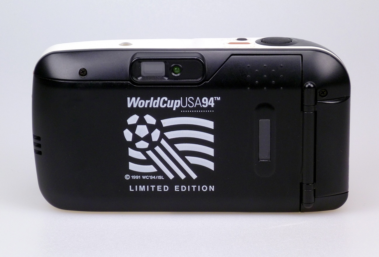 Kleinbild-Sucherkamera vom Weltmarktführer Canon in limitierter Auflage anlässlich der Fußball-Weltmeisterschaft 1994 in den USA, basiert auf der Serienausführung Canon Prima Mini.