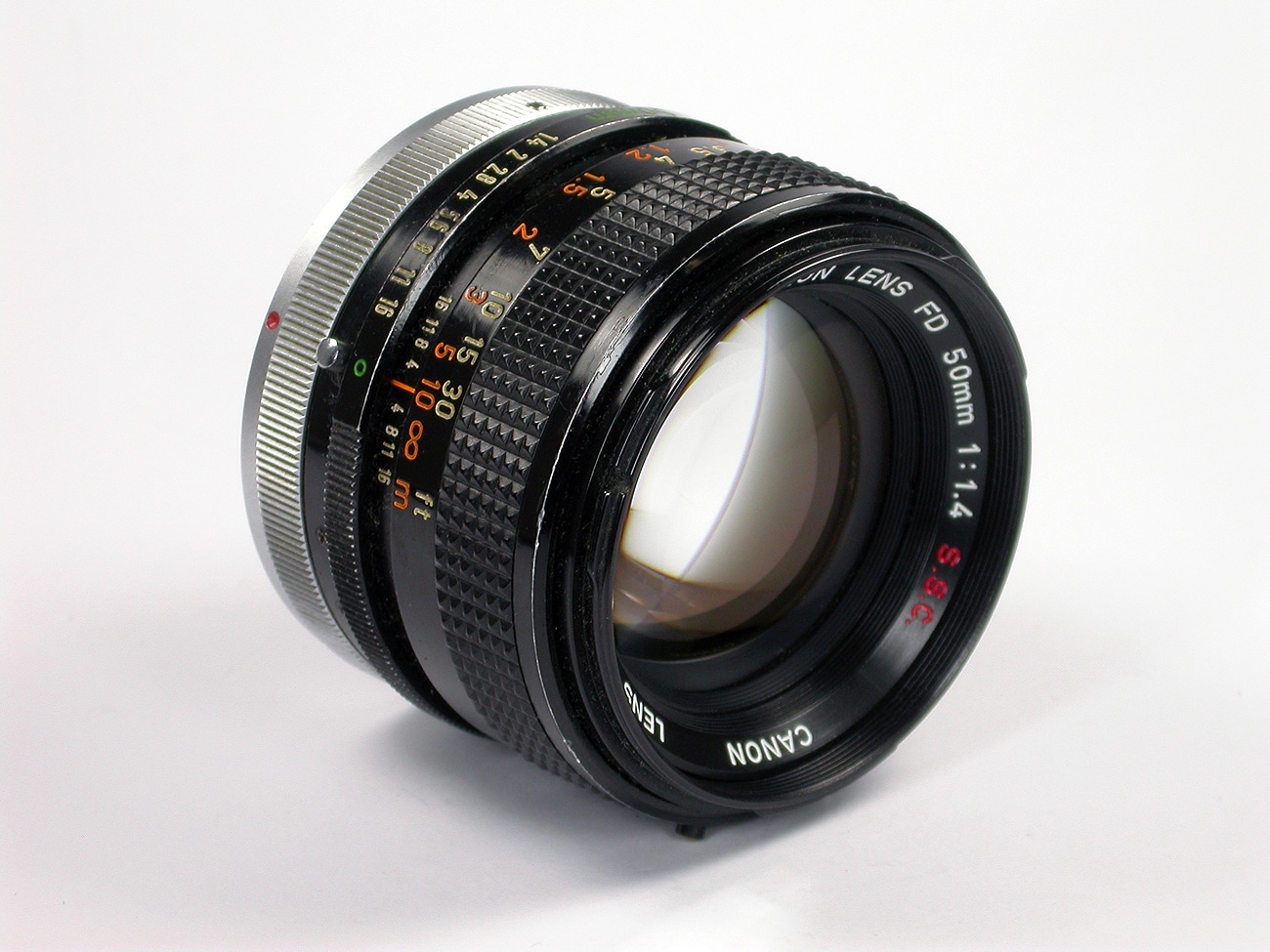 Lichtstarkes Normalobjektiv aus dem Canon-FD-Objektivsystem (Canon-Bajonett alt), 1970er Jahre. Automatikblende, manuelle Einstellung. Kürzeste Entfernung: etwa 45 cm. Das S.S.C. bedeutet bei Canon: Multicoating (Super Spectra Coating = Mehrfachvergütung). Zum Beispiel für die Canon AE-1 oder Canon A-1.