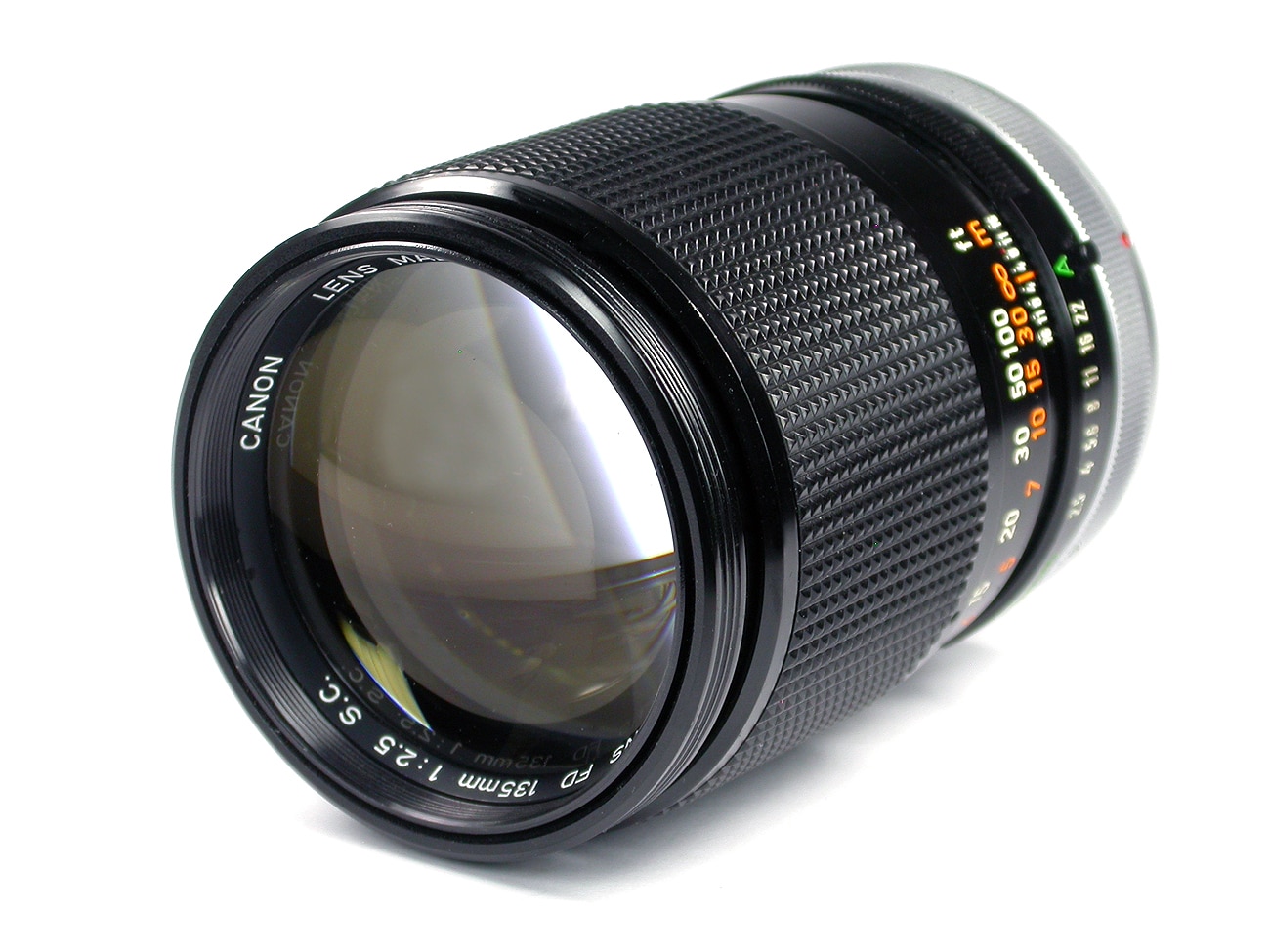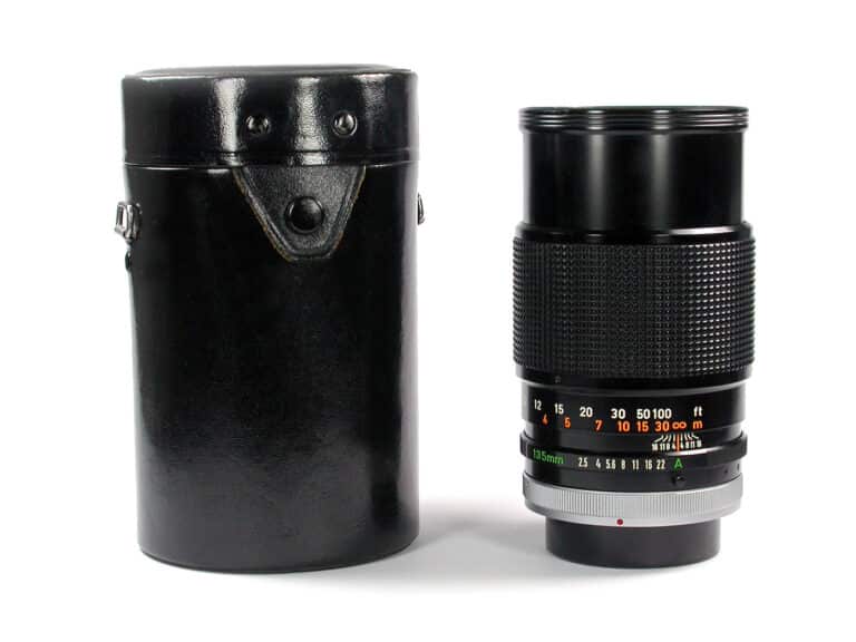 Leichtes Teleobjektiv aus den 1970er Jahren für Canon-Spiegelreflexkameras mit FD-Bajonett. 1:2,5/135 mm, Bildwinkel 10,2° (kurze Seite), 15,2° (lange Seite), 18,2° (Diagonale). Ausziehbare Gegenlichtblende.
