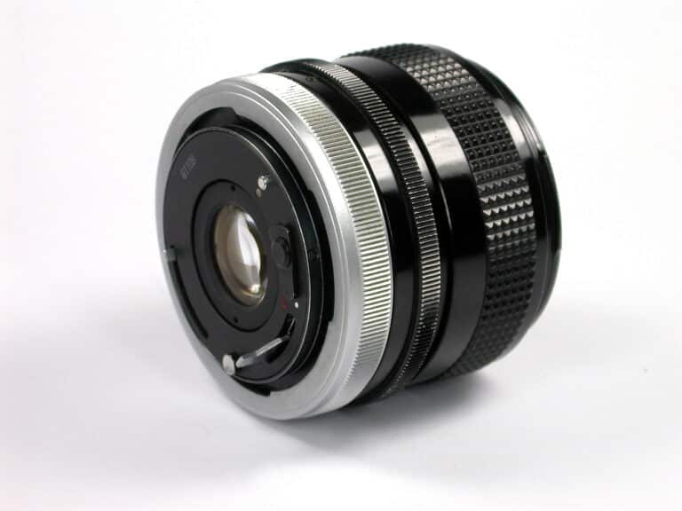 Canon-FD-Objektive gibt es in zwei Versionen: Die ältere – Bild – besitzt einen silberfarbenen, geriffelten Überwurfring, der um eine Achtel- oder Viertelumdrehung bewegt werden muss, um das Objektiv an der Kamera zu befestigen. Bei der neueren Version ab 1979 fehlt der Überwurfring. Hier muss das Objektiv gedreht werden, um es im Kamerabajonett zu fixieren.