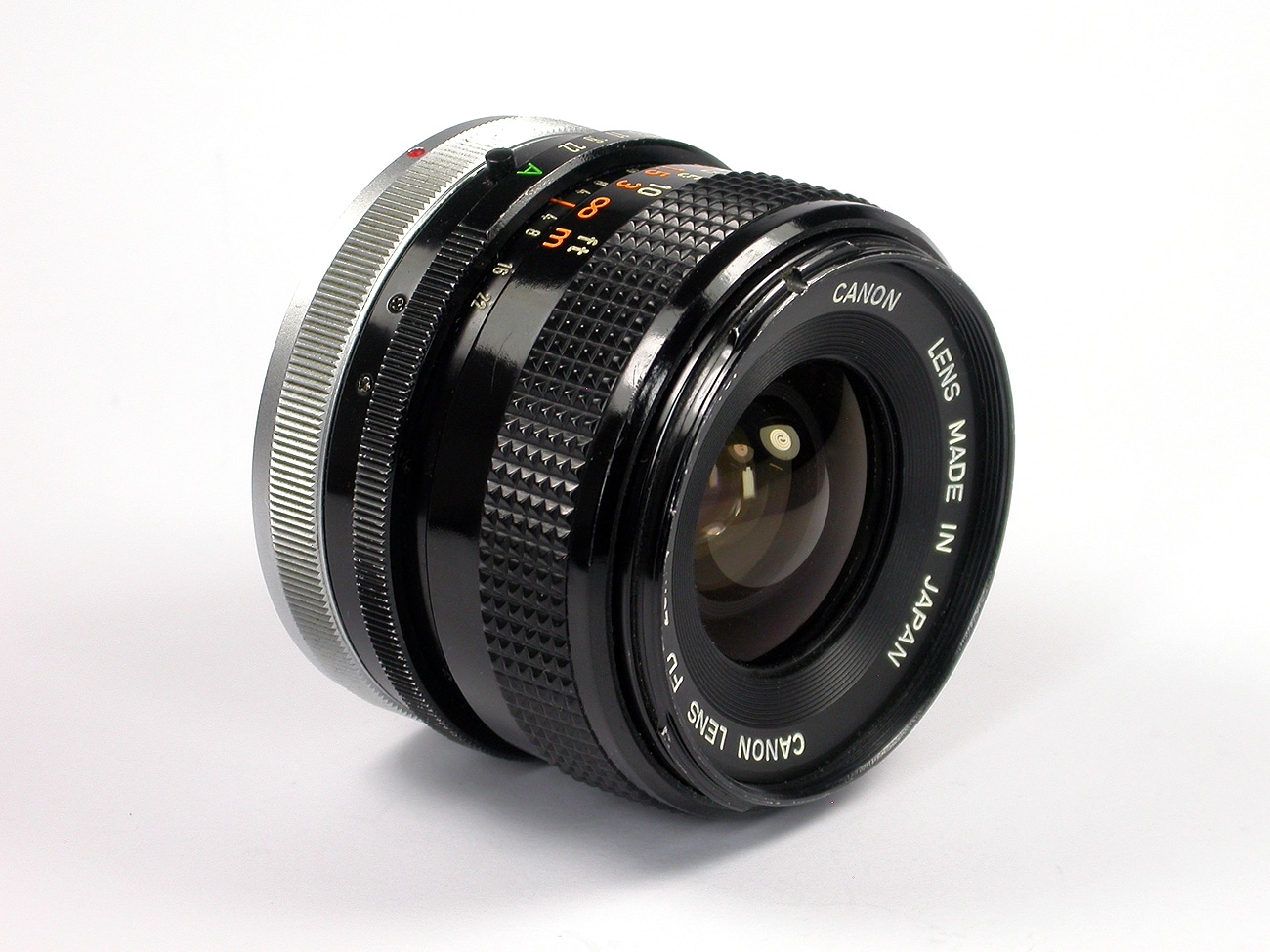 Weitwinkelobjektiv 1:2,8/28 mm mit dem alten Canon-FD-Bajonett (passt auch auf Kameras mit dem Vorgänger-FL-Bajonett). Kleinste Blende: 22, Bildwinkel: 46,4° (kurze Seite), 65,5° (lange Seite), 75,4° (Diagonale).