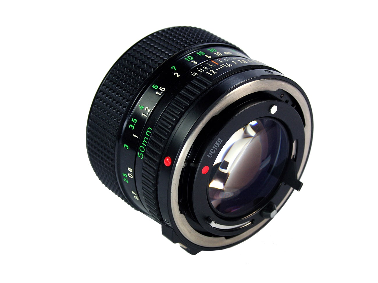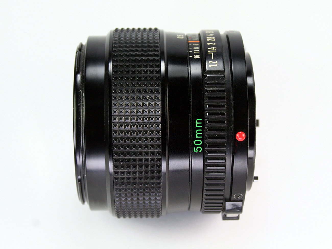 Japanisches Canon-Standardobjektiv für das Kleinbildformat 1:1,2/50 mm. Manuelle Schärfeeinstellung. Kleinste Blende: 16, Bildwinkel: 27° (kurze Seite), 39,6° (lange Seite), 46,8° (Diagonale). 7 Elemente in 6 Gruppen. Filter: 52 mm.