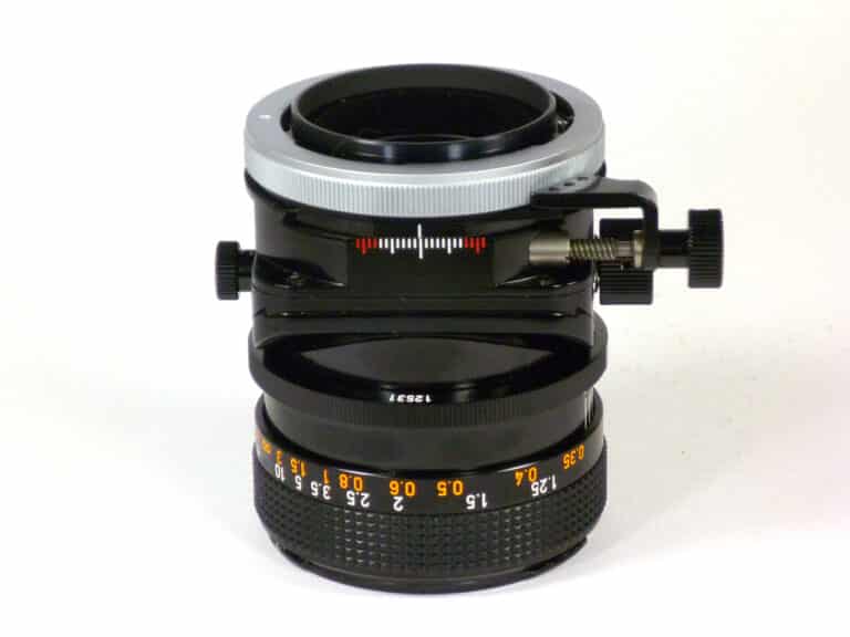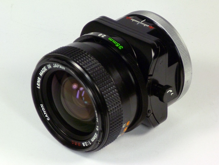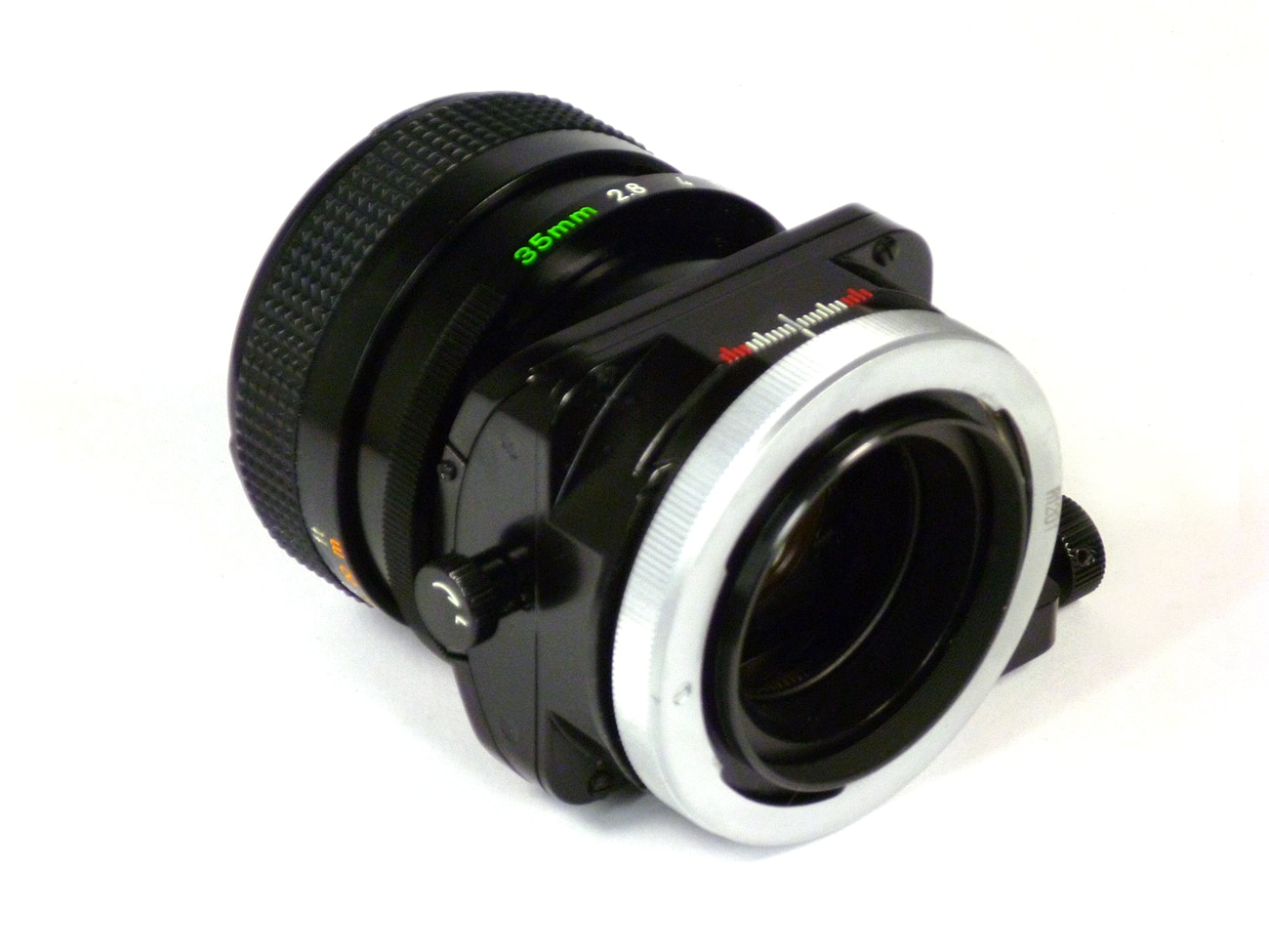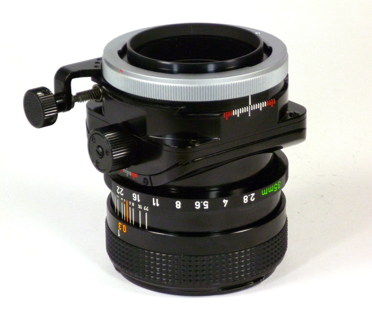 Ein Sonderobjektiv zur Vermeidung stürzender Linien und zur Steuerung der Schärfentiefe. Das sogenannte Tilt-Shift-Objektiv lässt sich nach links oder rechts aus der optischen Achse verschieben (Shift) und nach oben oder unten neigen (Tilt). Da das Objektiv auch um die Längsachse gedreht werden kann, ist eine Verstellung oder eine Kombination der Verstellmöglichkeit in jede Richtung möglich. Keine Blendenübertragung, nur manuelle Blendeneinstellung.