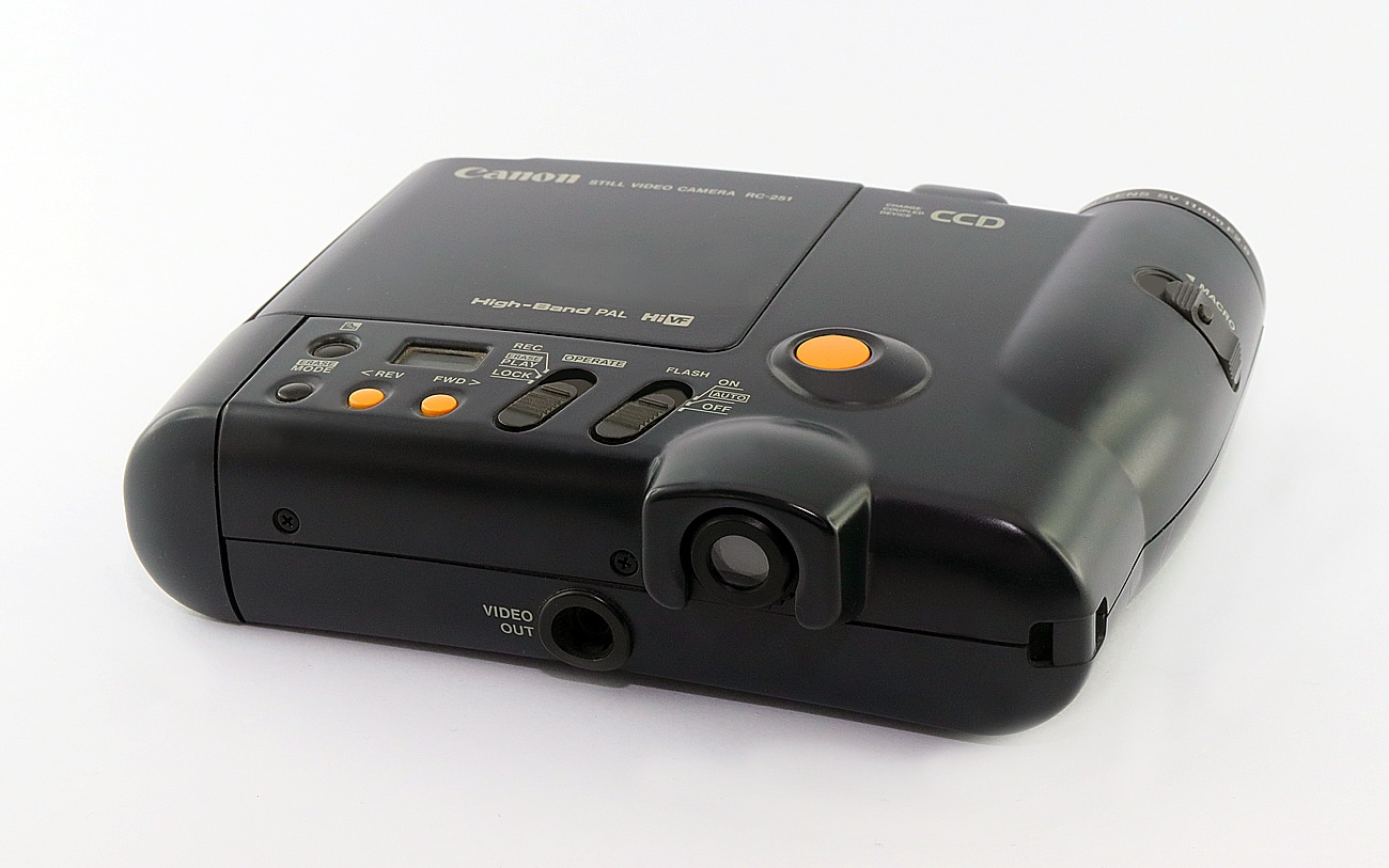 Früher Vorläufer der Digitalkameras: Die Canon ION Still Video Camera RC-251 High-Band PAL Hi VF aus 1988 war die PAL-Version der RC-250 für den europäischen Markt und in schwarzem (Bild) und weißem Kunststoffgehäuse lieferbar. Auffällig die flache, leicht nach oben gewölbte Form. Speziell für den europäischen Markt war die Modellbezeichnung ION entwickelt worden. Der damalige Preis betrug etwa umgerechnet 900 Euro.