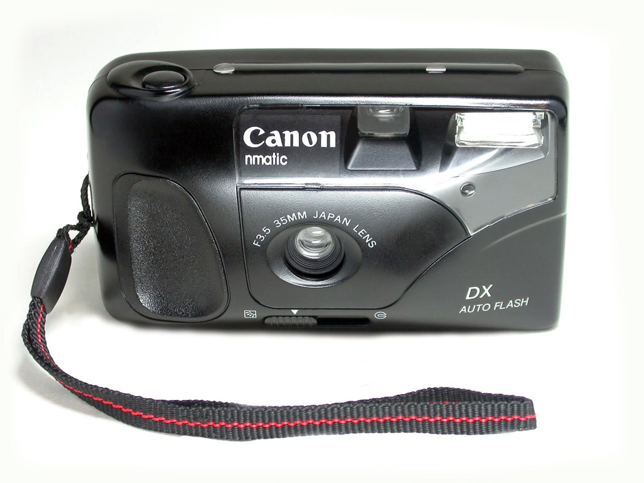 Eine Kleinbildkamera, die uns anfangs Rätsel aufgab. Niemand kannte dieses Modell als Canon-Typ, im Canon-Museum war es auch nicht finden. Der Schriftzug „Canon“ scheint sogar original zu sein, doch eine „nmatic“ gibt es nicht von Canon. Das bestätigte auch Canon Deutschland. Also wieder eine der sehr beliebten Canomatic-Fälschungen? Immerhin handelt es sich um ein gefälliges Design. Weitere Ausstattung: DX-Filmeinstellung, motorischer Filmtransport, eingebauter Blitz, gewölbte Filmbühne. Kein Autofokus, kein Nicht original, nur originell…