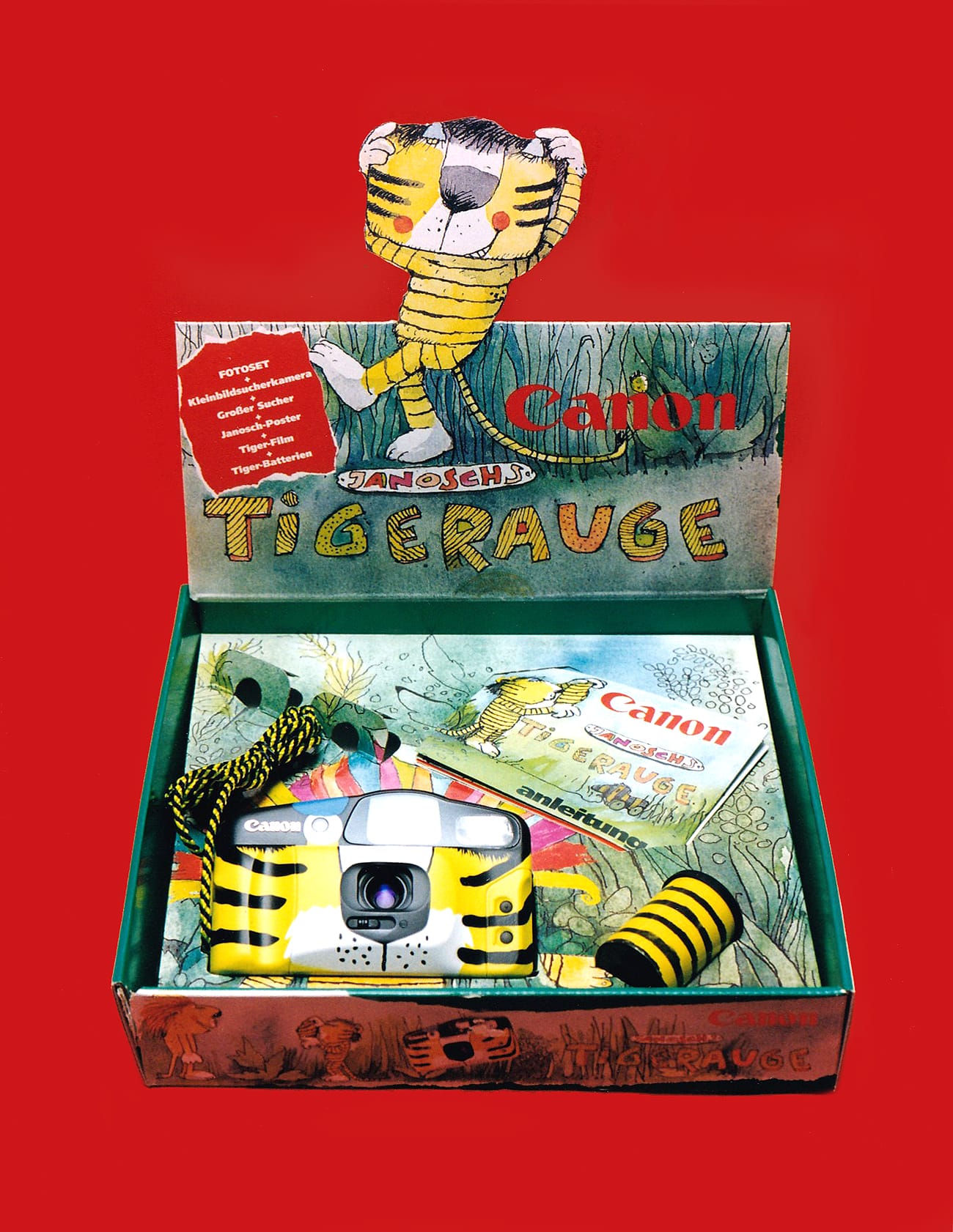 Die Prima BF-7 Janoschs Tigerauge ist eine limitierte Sonderausgabe einer Canon-Kompaktkamera für den Kleinbildfilm 135, die in Zusammenarbeit mit dem deutschen Kinderbuchautor Janosch entwickelt wurde und bei Sammlern hoch in Kurs steht – vor allem in der kompletten Originalverpackung wie im Deutschen Kameramuseum. Lizenziert von Janosch und dem Diogenes-Verlag, 1995. Das 35-mm-Objektiv hat eine Lichtstärke von 1:3,5. Die automatische Belichtungssteuerung ermöglicht Zeiten von 1/4 bis 1/250 Sekunde bei ISO 50 bis ISO 3.200. Fixfokus (scharf ab 0,5 Meter). Der integrierte E-Blitz reicht bis etwa 3 Meter.