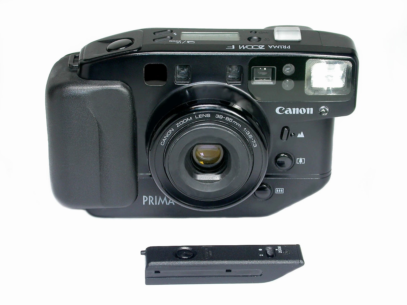 Üppig ausgestattete gerade noch Kompaktkamera von Canon, 1989, für den Kleinbildfilm. Motorisch verstellbares fest eingebautes Zoomobjektiv Canon 1:3,6-7,3/39-85 mm, 9 Elemente in 8 Gruppen, Zoom-Sucher mit AF-Marken und Parallaxrahmen, Motorischer Filmtransport, eingebauter E-Blitz mit Zoom-Funktion entsprechend der Objektivstellung, abnehmbare IR-Fernbedienung (unten im Bild), die im Boden eingeschoben wird. Kamerabatterie 2 CR 5 Lithium 6 Volt.