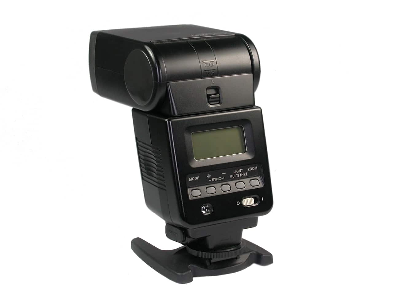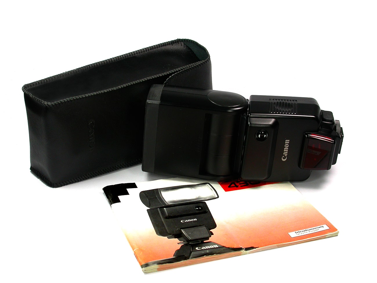 Modernes Computerblitzgerät für die analogen Canon-Kameras der EOS-Serie, Mitte der 1990er Jahre gebaut. Nach oben und seitlich schwenkbarer Reflektor mit motorischem Zoom (Weitwinkel-/Televerstellung) je nach Objektivbrennweite, Leitzahl 35 bei 50 mm und ISO 100. Verschiedene Automatikprogramme (mit Messwertspeicher, TTL-Messung usw.). Automatische Umschaltung der Synchronzeit an der Kamera bei Blitzbereitschaft. Stroboskopblitze bei verringerter Leitzahl. Synchronisation auf den zweiten Verschlussvorhang. Stromversorgung: 4 x Mignonzellen AA.