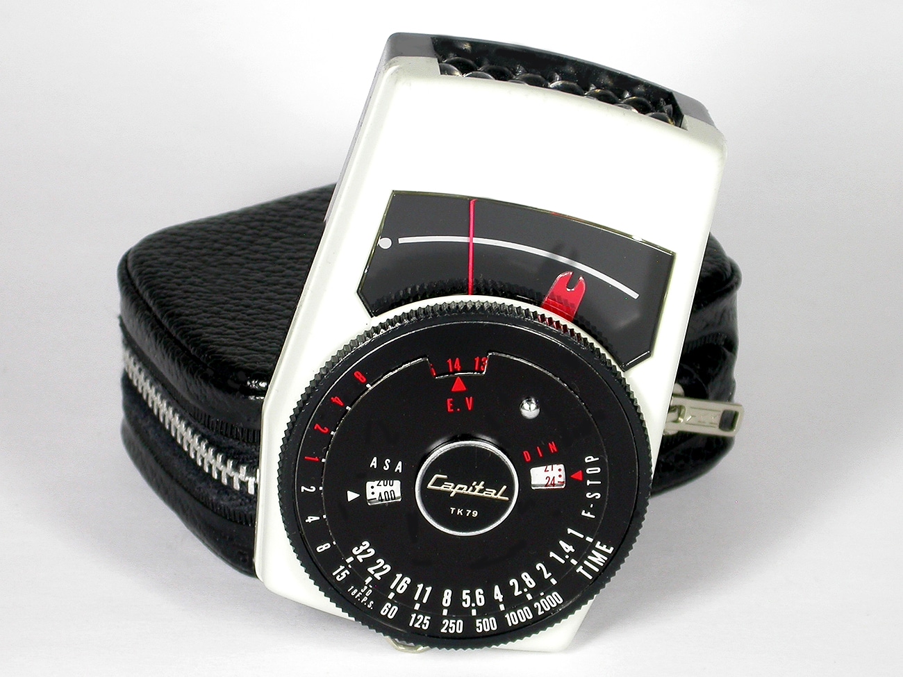 Japanischer Selen-Belichtungsmesser der US-amerikanischen Vertriebsfirma Capital, in Deutschland in ähnlicher Ausführung im Angebot von Dörr (Danubia) und Hama, etwa Anfang der 1980er Jahre. Ähnlich auch bei Foto-Quelle. Empfindlichkeit: 9 bis 39 DIN (6 bis 6.400 ASA), Belichtungszeiten: 8 Sekunden bis 1/2.000 Sekunde, Blenden 1 bis 32. Lichtwerte: 0 bis 20. Funktioniert auch heute noch – und das eben ganz ohne Batterie. Im Museum mit Lederetui.