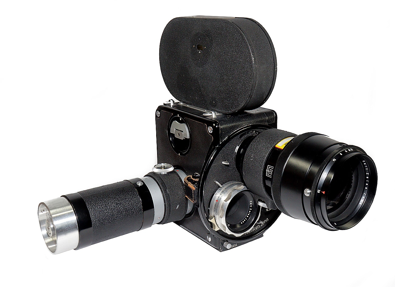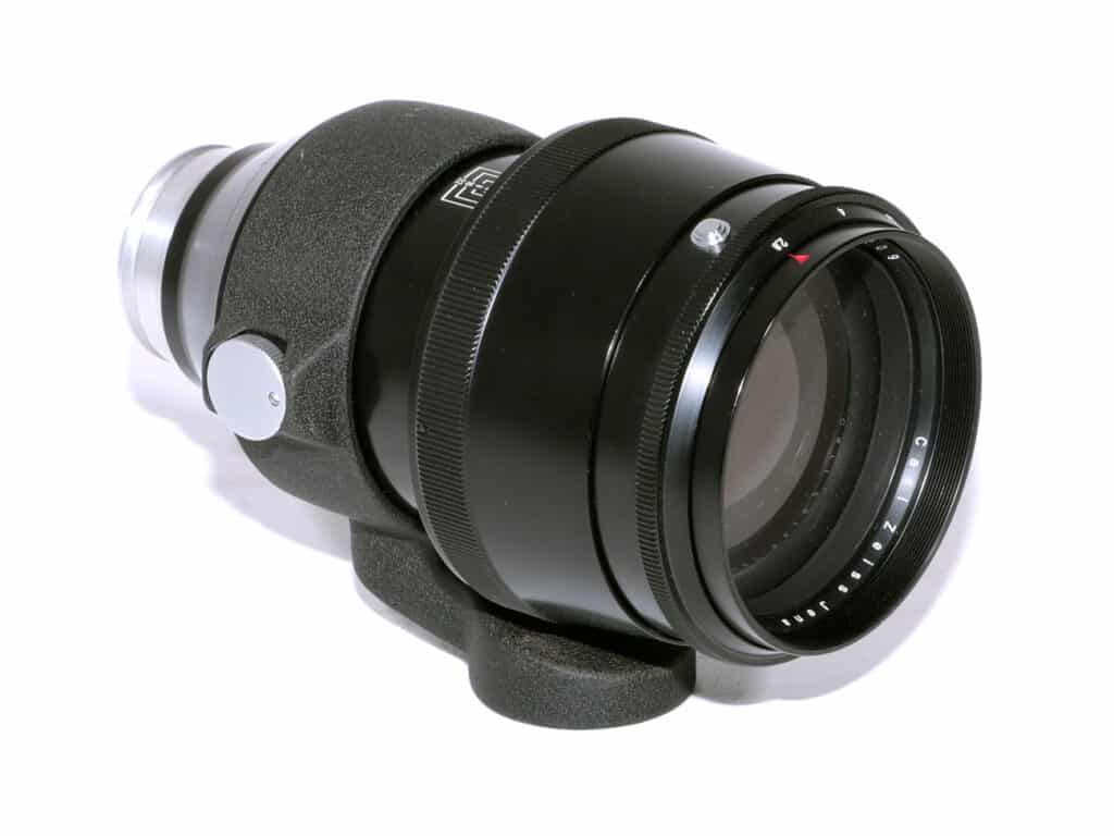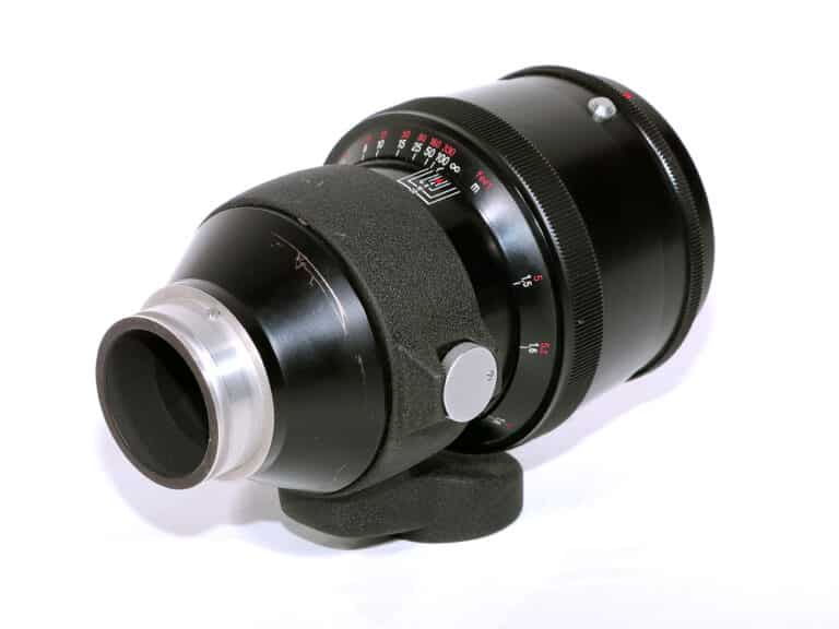Teleobjektiv für die 16-mm-Schmalfilmkamera Pentacon AK 16 aus der früheren DDR. Spezieller Bajonett-Schnellwechselanschluss der AK 16. Ursprünglich war das Gerät in Jena im Einsatz, wie der Inventaraufkleber „Volkseigentum Friedrich-Schiller-Universität“ ausweist. Manuelle Fokussierung; Abblendung bis 22 möglich.