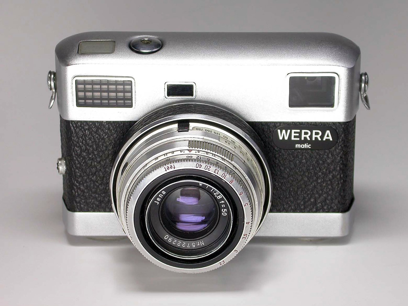 Bemerkenswerte Messsucherkamera für den Kleinbildfilm 135 (Aufnahmeformat 24 x 36 mm), hergestellt von 1961 bis 1964: die Werra matic aus der DDR. Systemkamera für Wechselobjektive mit Werra-Bajonett, hier mit Normalobjektiv Jena T 1:2,8/50 mm; weitere Wechselobjektive: Tele Cardinar 1:4/100 mm aus Jena und ein Weitwinkel Flektogon 1:2,8/35 mm von Carl Zeiss Jena; manuelle Fokussierung mit Hilfe des gekuppelten Entfernungsmessers. Messsucher mit eingeätzten Markierungen für die unterschiedlichen Brennweiten; Blende und Belichtungszeit eingespiegelt. Mechanischer Zentralverschluss Prestor RVS (B, 1 bis 1/750 Sekunde); manuelle Belichtungssteuerung mit Hilfe des gekuppelten Belichtungsmessers. Ungewöhnlicher Filmtransport (durch Drehen des hintersten belederten Rings um das Objektiv). Blitzkontakt (X und M).