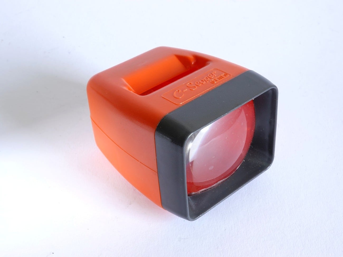 Diabetrachter des deutschen Herstellers Carl Neithold, Frankfurt am Main, für das Kleinbildformat, 1970er Jahre. Das Dia (Rahmengröße 5 x 5 cm) wird von oben in den Schlitz eingeführt, wobei gleichzeitig ein Berührungskontakt die Lampe einschaltet. Hinter dem Betrachtungsfenster sorgen 2 Linsen für eine etwa dreifache Vergrößerung. Die Stromversorgung erfolgt durch 2 Babyzellen zu je 1,5 Volt. Das Modell gab es in mehreren Farben, wie viele der damaligen Zubehörteile aus Kunststoff.