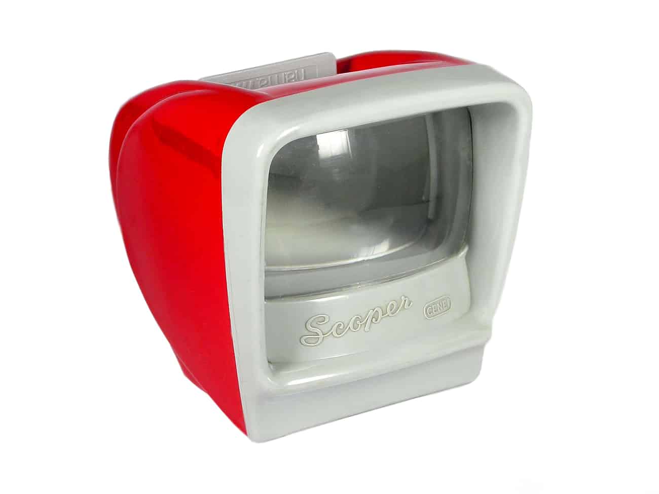 Diabetrachter des deutschen Herstellers Carl Neithold/Frankfurt am Main für das Kleinbildformat, 1960er Jahre. Das Dia (Rahmengröße 5 x 5 cm) wird von oben in den Schlitz eingeführt, wobei gleichzeitig ein Berührungskontakt die Lampe einschaltet. Hinter dem Betrachtungsfenster sorgen 2 Linsen für eine etwa dreifache Vergrößerung. Das Gehäuse kann, je nach gewünschtem Betrachtungswinkel, auch nach hinten gekippt werden. Die Stromversorgung erfolgt durch 2 Babyzellen je 1,5 Volt.