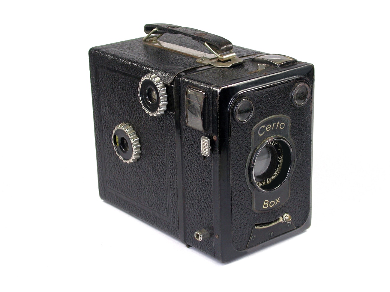 Zweiformat-Boxkamera für den Rollfilm 120 (Aufnahmeformate 6 x 9 oder 4,5 x 6 cm), hergestellt etwa 1933 im Certo Kamerawerk, Dresden 46. Das obere Rad an der rechten Kameraseite dient dem Filmtransport, das weiter unten in der Mitte liegende Rad der Formatumstellung. Objektiv: Ceronar 1:11; zwei Entfernungsbereiche dank eingebauter Nahlinse: 2 bis 5 Meter und 5 Meter bis unendlich. Diese Nahlinse wurde übrigens unüblicherweise zwischen der Vorder- und der Hinterlinse eingeschwenkt.