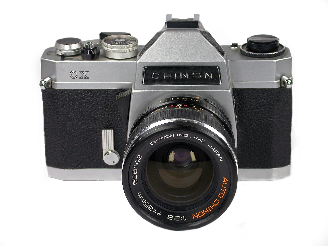 Einäugige Spiegelreflexkamera (SLR) für den Kleinbildfilm 135 (Aufnahmeformat 24 x 36 mm), hergestellt ab 1975. Objektivanschluss: M-42-Gewinde; hier mit dem leichten Weitwinkel Auto Chinon 1:2,8/35 mm; manuelle Scharfeinstellung. Prismensucher. Mechanischer Schlitzverschluss (B, 1 bis 1/1.000 Sekunde; Selbstauslöser). TTL-Integralmessung; manuelle Belichtungssteuerung.