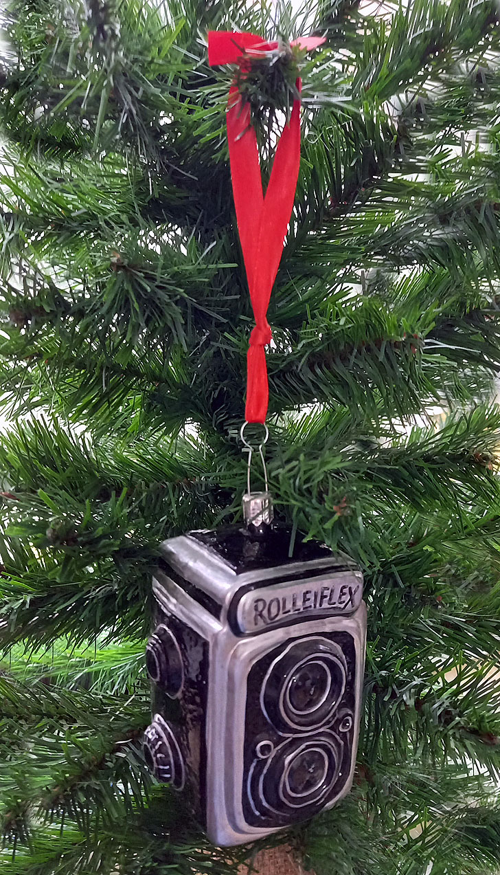 Unser Museumsleiter liebt ja solche Foto-Gimmicks und er weiß sich da in guter Gesellschaft mit vielen Sammlern von Photographica. Hier zum Beispiel eine etwa 10 x 7 x 7 cm kleine „Rolleiflex“ für den Weihnachtsbaum des verwöhnten Rollei-Sammlers. Die federleichte Mini-„Kamera“ auch blechähnlichem unbekannten Material, möglicherweise handbemalt, hat einen klassischen Aufhänger für Christbaumkugeln und ein 12 cm langes rotes Stoffband. Wie gut, dass ein kleiner Christbaum aus Kunststoff noch irgendwo herumstand, um diese stimmungsvollen Aufnahmen machen zu können. Hersteller und Bauzeit sind unbekannt.