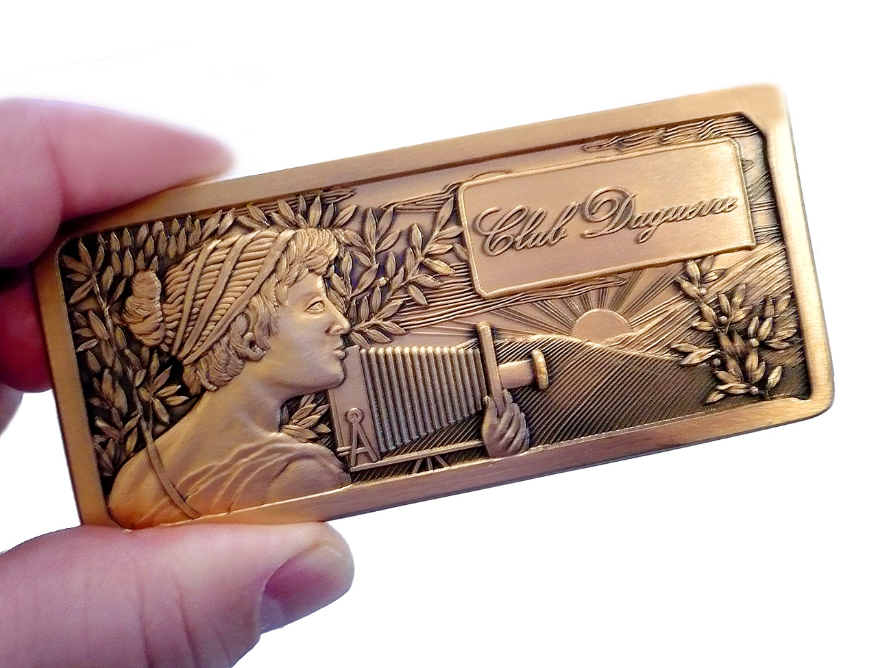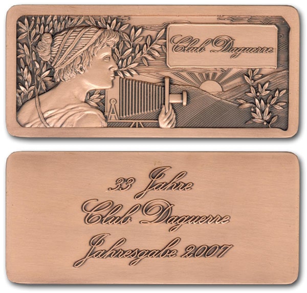 Als ernsthafter Sammler von Photohistorica ist man ja Mitglied beim renommierten Club Daguerre. Diese Messingplakette (etwa 11 x 5 cm) gab es als Jahresgabe 2007. Anlass: „33 Jahre Club Daguerre“.