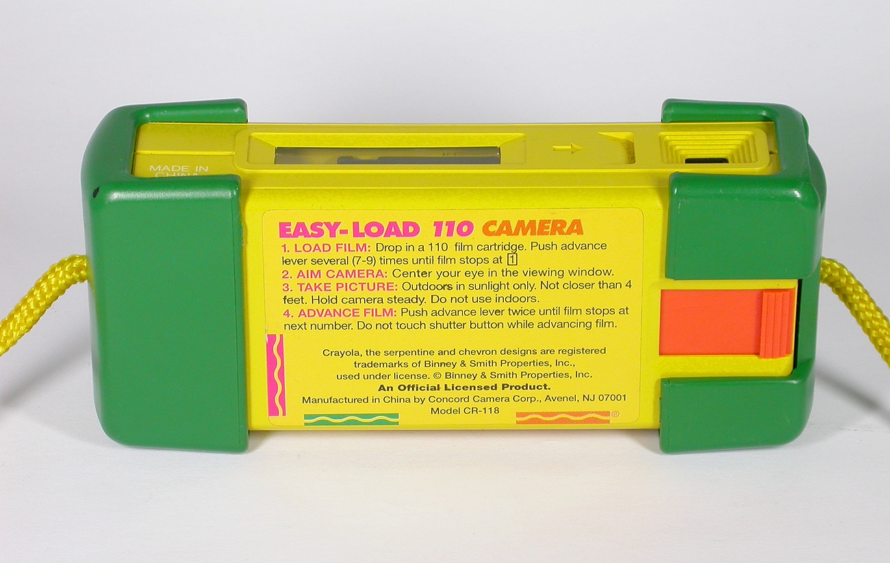 Einfallsreich gestaltete Pocketkamera für den Pocketfilm 110 (Aufnahmeformat 13 x 17 mm), Model CR-118, aus China. Fixfokus-Objektiv, Mindestabstand vier Fuß („Not closer than four feet.“). Durchsichtsucher. Einfachverschluss; manuelle Belichtungssteuerung. Ausschließlich zur Verwendung im Freien („outdoor use“) bei Sonnenlicht. Manueller Filmtransport. Mit farblich abgestimmter Tragekordel.