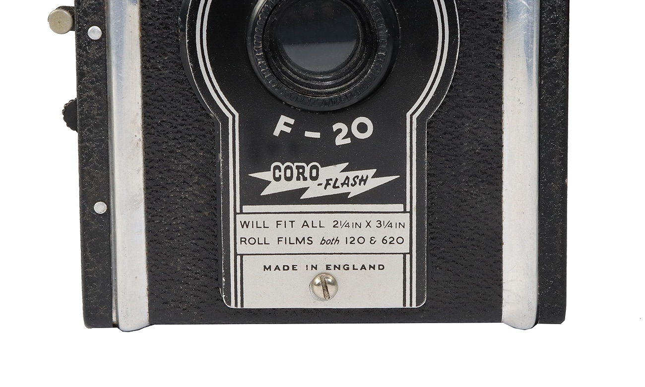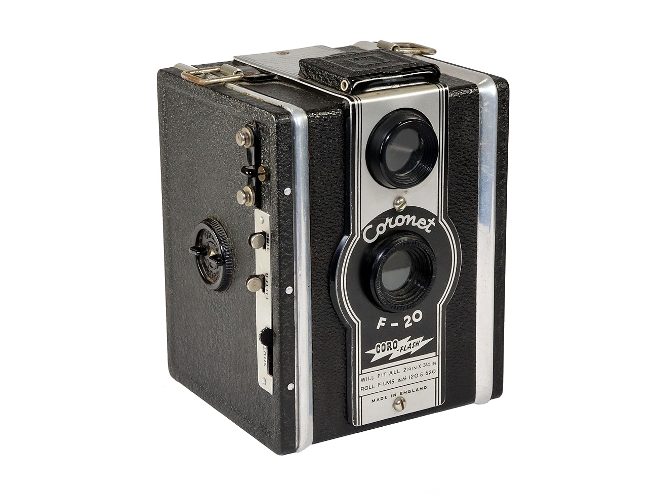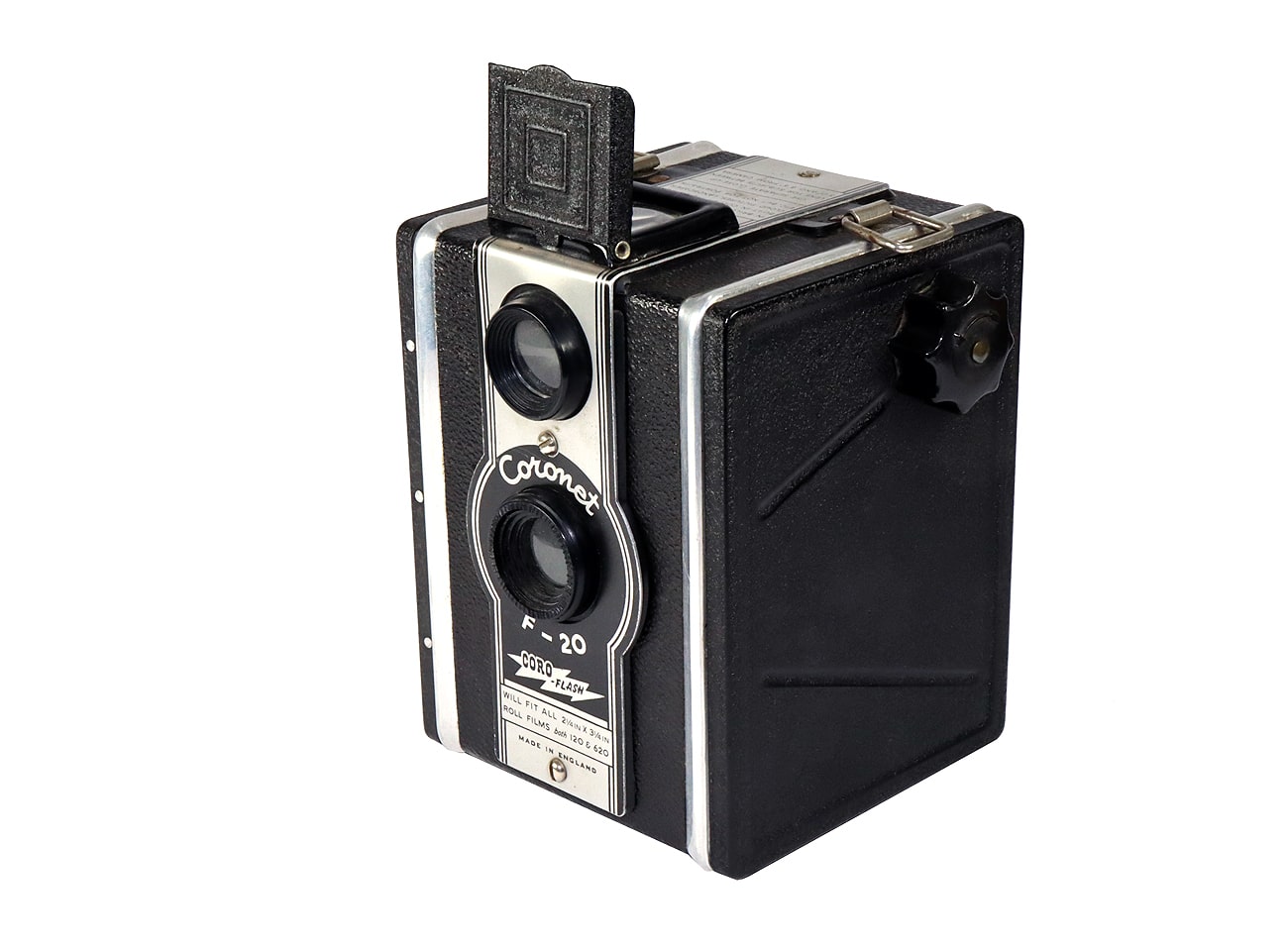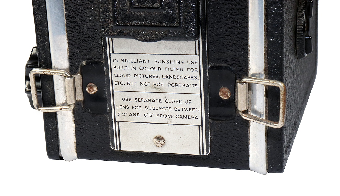 Boxkamera (1950) für den Rollfilm 120/620/B2 (Aufnahmeformat 6 x 9 cm), Fixfokus, Einfachverschluss und B, manuelle Belichtungssteuerung, Blechgehäuse, ausklappbarer Schutzdeckel für den Brillantsucher. Grünfilter einschwenkbar. Aufsteckbarer spezieller Blitz (die beiden Metallknöpfe oben links im Bild). Beim Museumsexemplar war der Blitz nicht dabei.