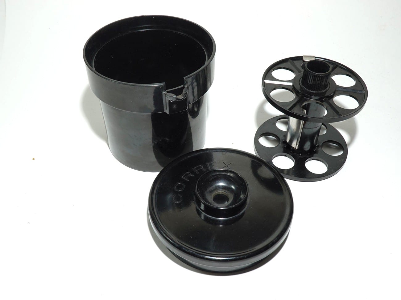 Die Bestandteile: Dose, Deckel und Spirale. Der Stab, der zum Drehen der Spirale in die Deckelöffnung gesteckt wurde, fehlt. Das spezielle Noppenband (Correx-Band), das an der Spirale befestigt war und das Zusammenkleben der Filmwindungen verhindern sollte, ist bis auf kleine Reste verloren.
